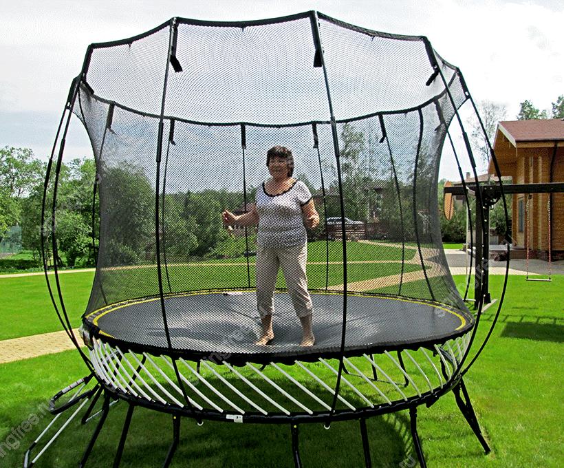 Сеть безопасностиСеть безопасности изготовлена также из высокопрочного стабилизированного полипропилена. Ткется по лицензии и эксклюзивно для Springfree Trampoline на основе тех же технологий, что и рыболовные сети — каждая ячейка сети самостоятельно зафиксирована и при повреждении одной ячейки дальнейшие не «расползаются». Размеры ячеек подобраны таким образом, чтобы пальчики даже самых маленьких детей не могли проникнуть и застрять в них. Сеть растягивается, эффективно улавливая прыгуна, а также обладает амортизирующими свойствами — возвращая ребенка в центр батута.