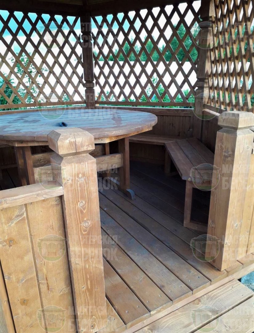 Деревянная беседка “Богатырская” это мощь и сила дерева! Резные столбы придают этой беседке Русский Стиль и Русский Дух. Вся конструкция выполнена их сухих материалов камерной сушки. Только в таком случае беседка (и ее пропитка) будет служить Вам долго. На нашем производстве возможны любые модификации и изменения размеров и дизайна.