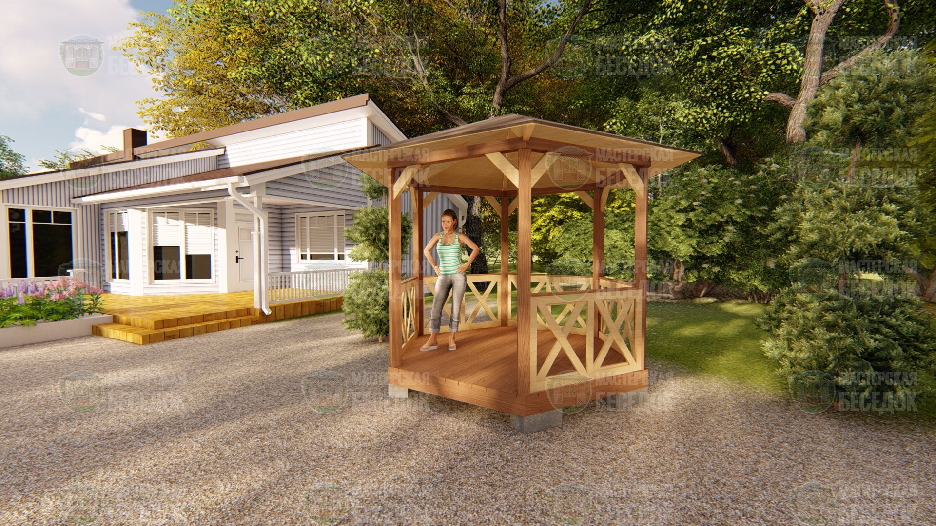Деревянная беседка “Московская Жара” простая, но в то же время стильная беседка с ограждениями в виде перекрестий и массивными деревянными столбами. В такую беседку мы можем дополнительно изготовить и смонтировать деревянные лавки по периметру.
