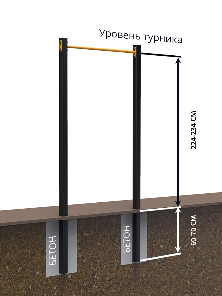 - Высота брусьев от поверхности земли от 120 см до 140 см (в зависимости от глубины установки)