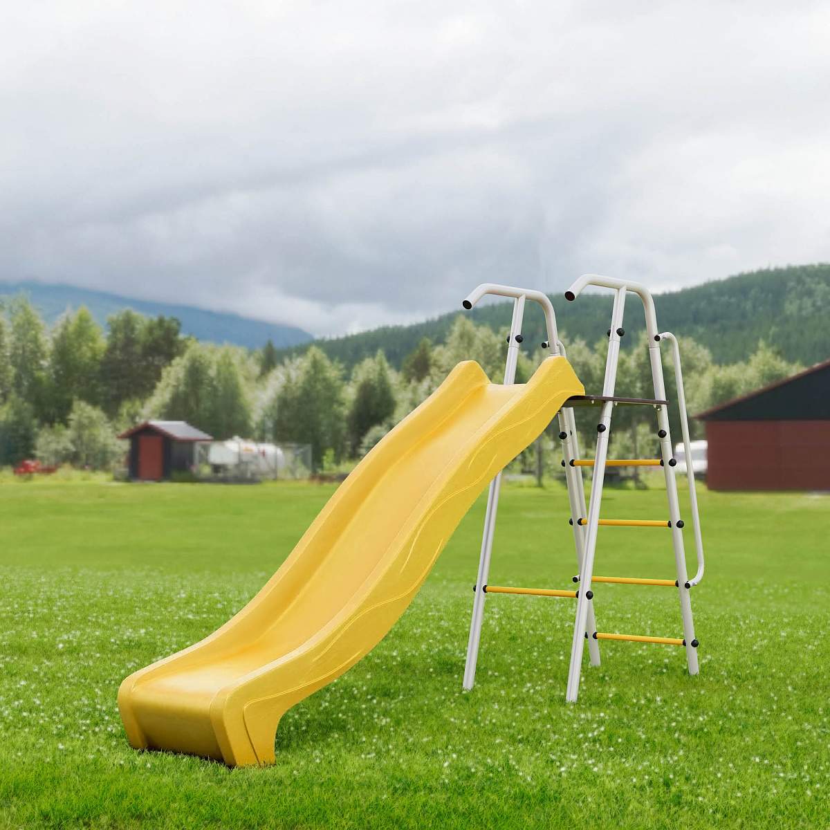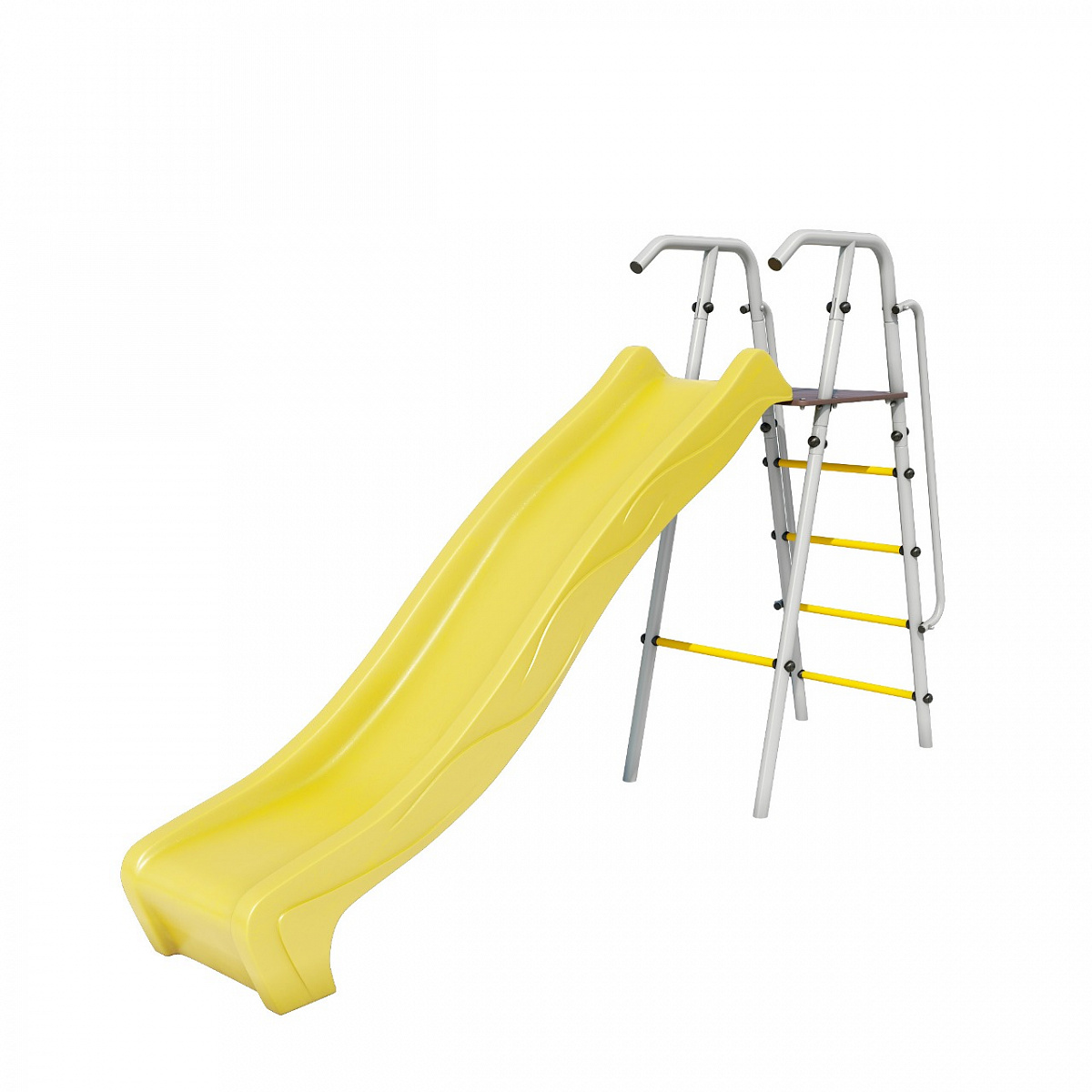 Высокая горка прекрасно дополнит игровую зону и обеспечит много часов веселых игр на свежем воздухе. Высота изделия – 1,67 м, длина – 2,7 м. Горка выполнена из качественных материалов: стали и пластика. Стальной каркас обеспечивает надежность и долговечность эксплуатации, а безопасный пластик обладает высокой прочностью и не выцветает на солнце. Изделие устойчиво к температурным изменениям и погодным условиям (дождь, снег, солнце и пр.). Горка не леденеет зимой и сильно не нагревается на жарком солнце. Бортики обеспечивают безопасность ребенка, защищая от падений, а обтекаемая форма горки без острых углов предотвращает ушибы и синяки. Поручни помогают забираться на горку даже малышам (от трех лет), с помощью маленькой лестницы можно обучить ребенка подниматься по ступеням и укрепить хват.