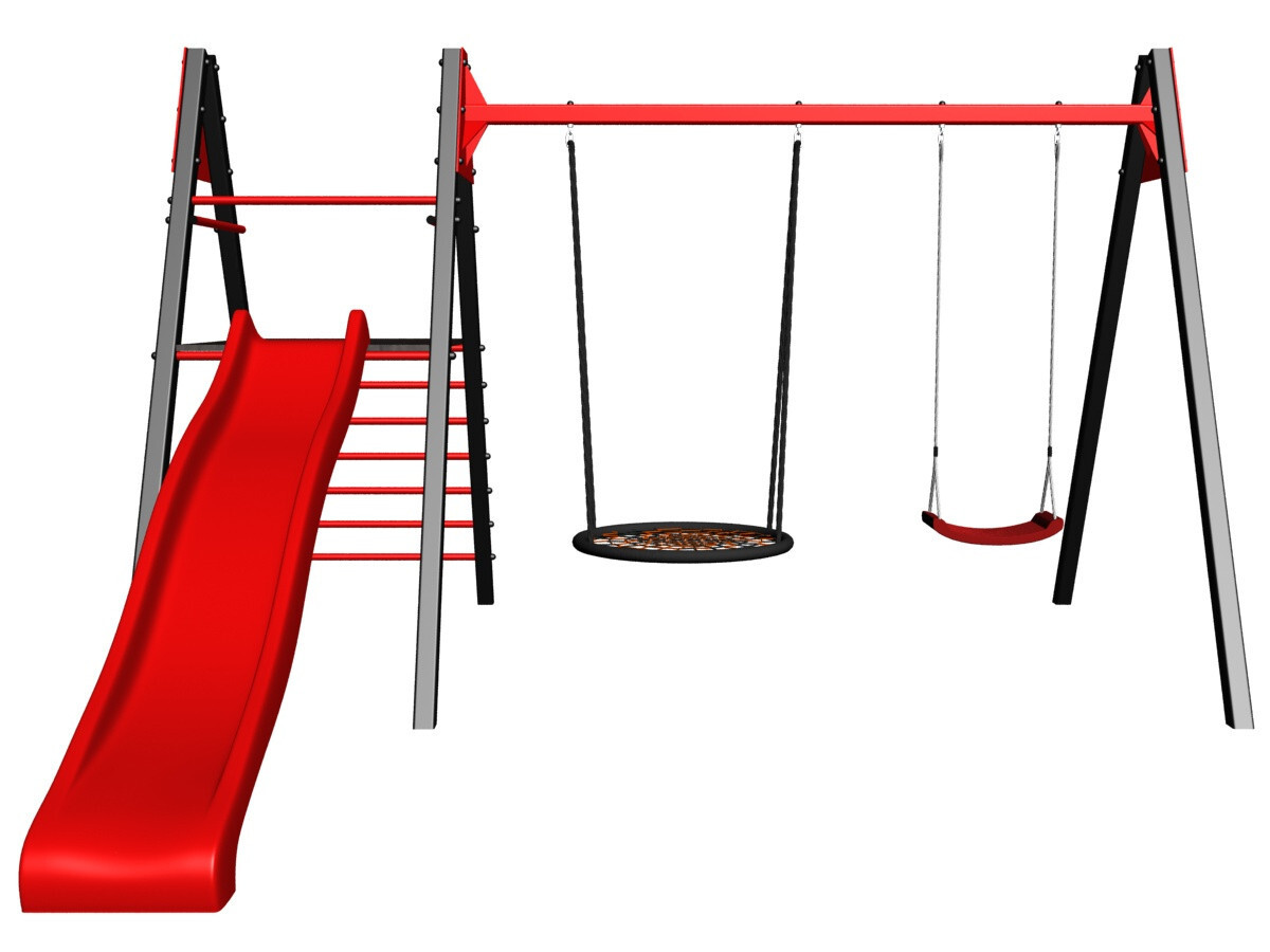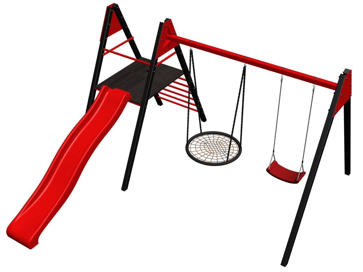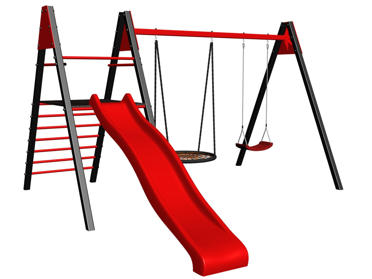 Комплектация: рама качелей Sv Sport Maxi, подвесы для навесного оборудования 5 шт, качели-гнездо "Grad" d 0,6м либо d 0,8м либо d 1м либо d 1.15м, качели пластиковые, комплект горка Sv к уличным качелям, скат пластиковый)