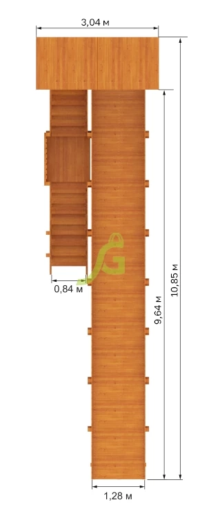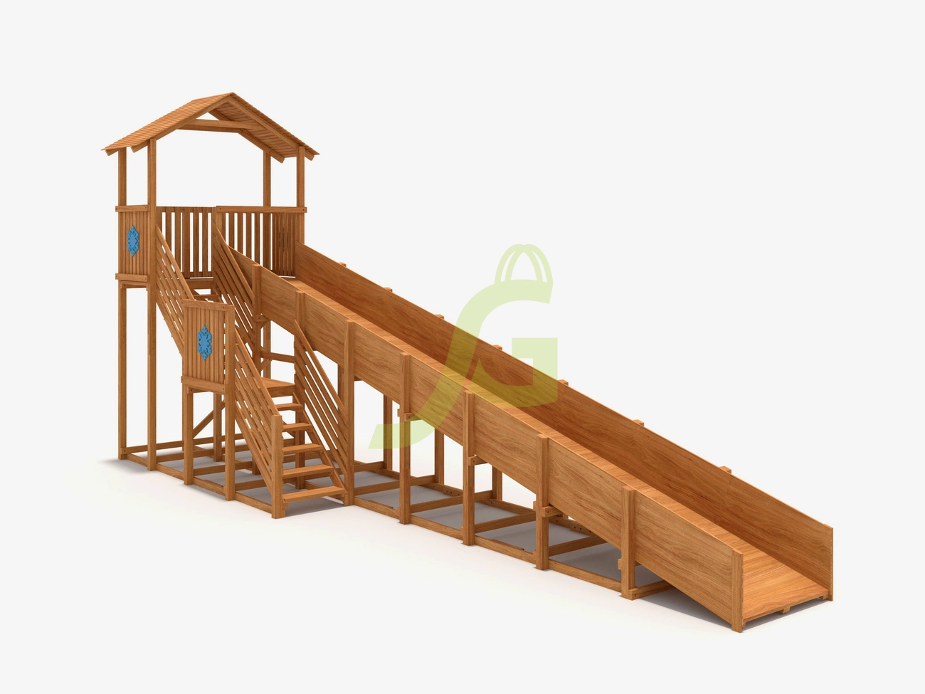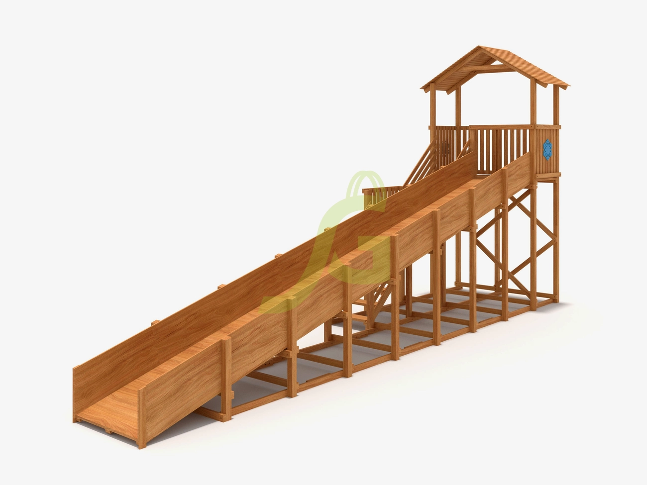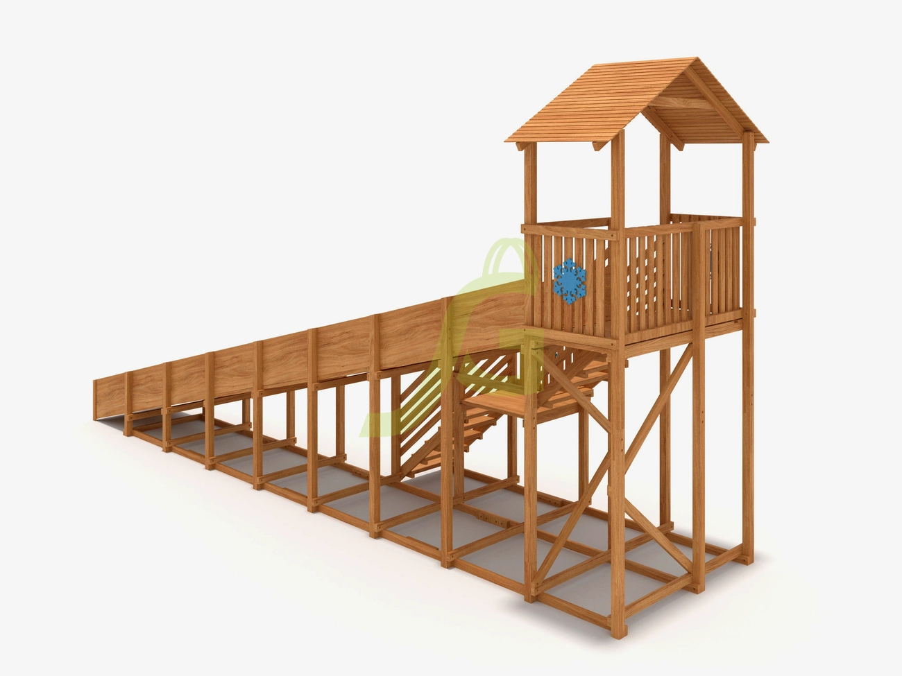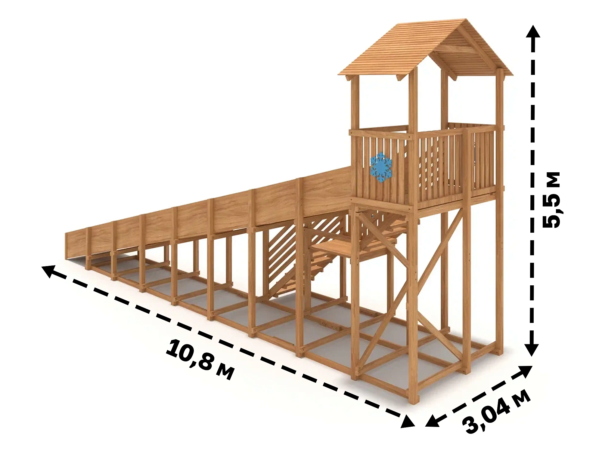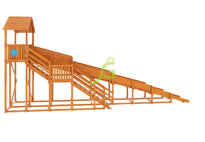 10-ти метровый скат безопасен для катания детей дошкольного возраста, потому что он имеет оптимальную высоту. Дети могут подниматься вверх по удобной лестнице, держась за перила. Площадка в верхней части достаточно просторная и оборудована деревянной крышей. Она позволит ребятам укрыться от обильных осадков, ветра, весело общаясь друг с другом.