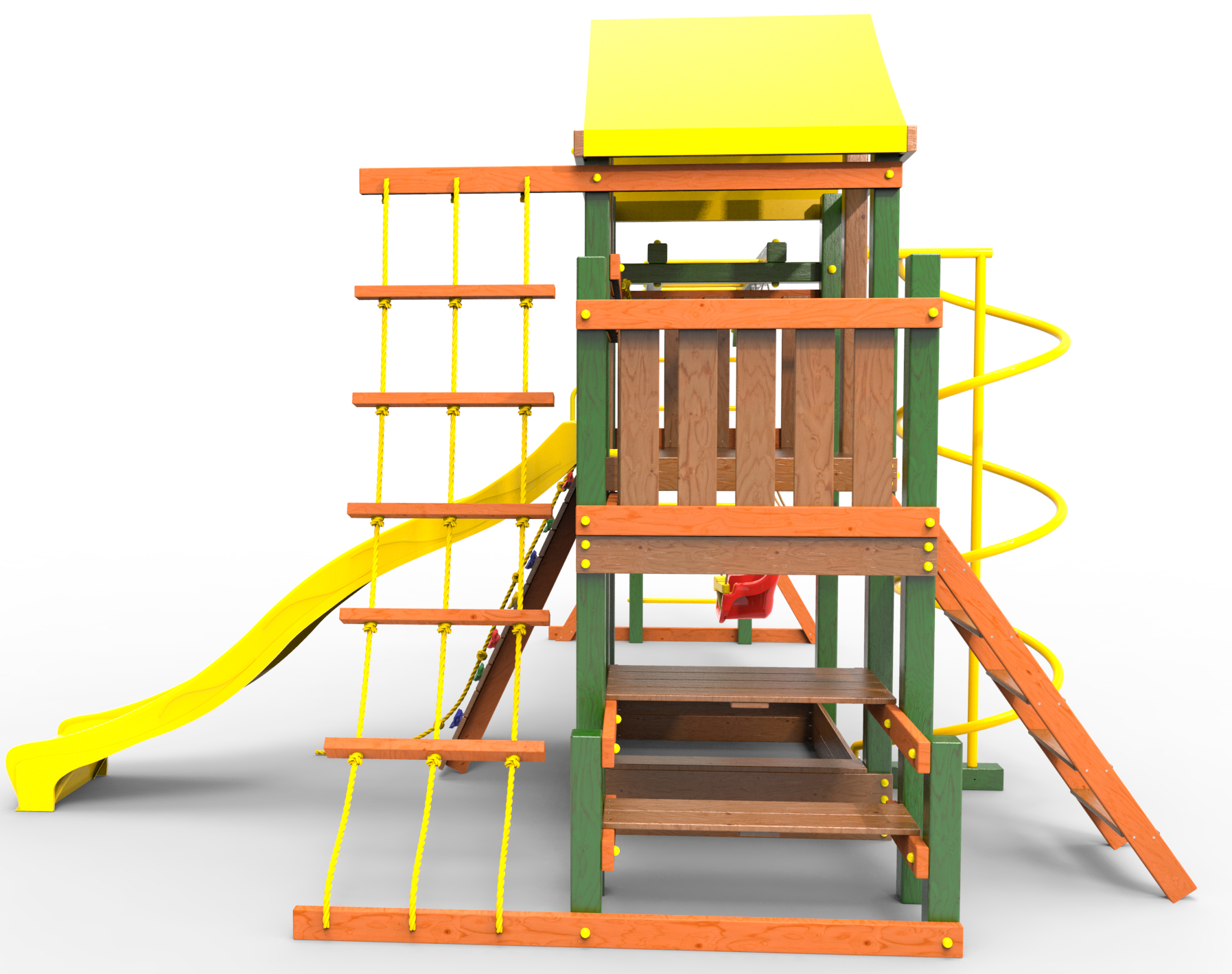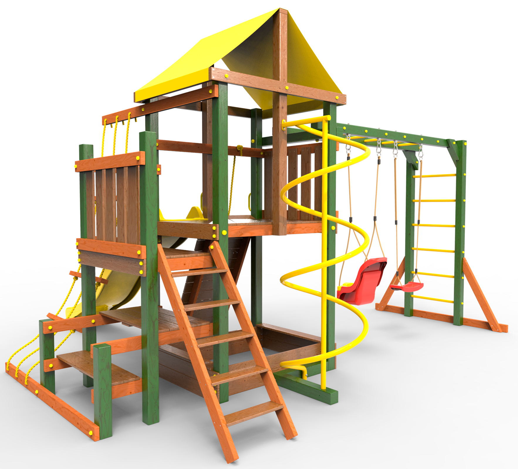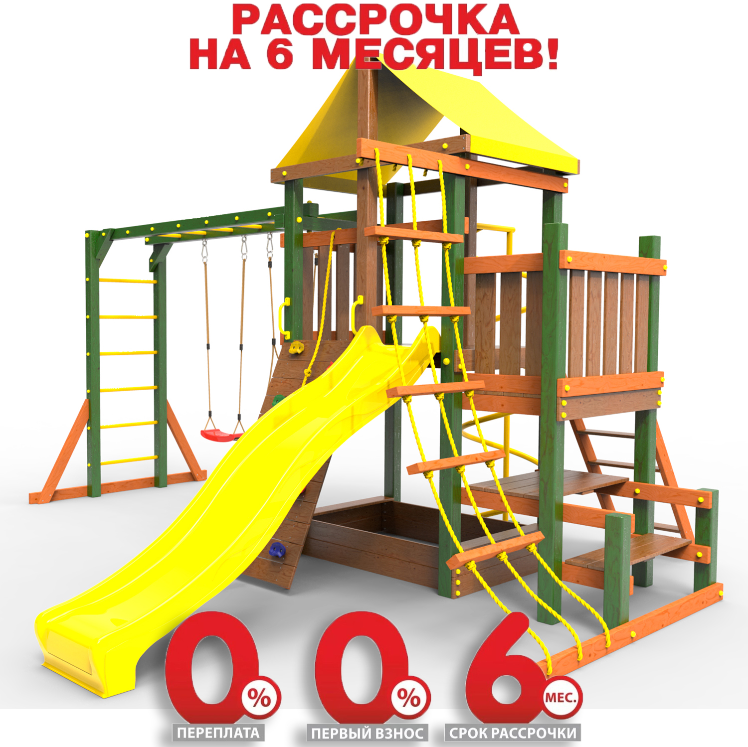 ● деревянная крыша ● трап 2м с канатом ● поручни для лестницы ● диван на цепях двухместный ● столик в песочницу
