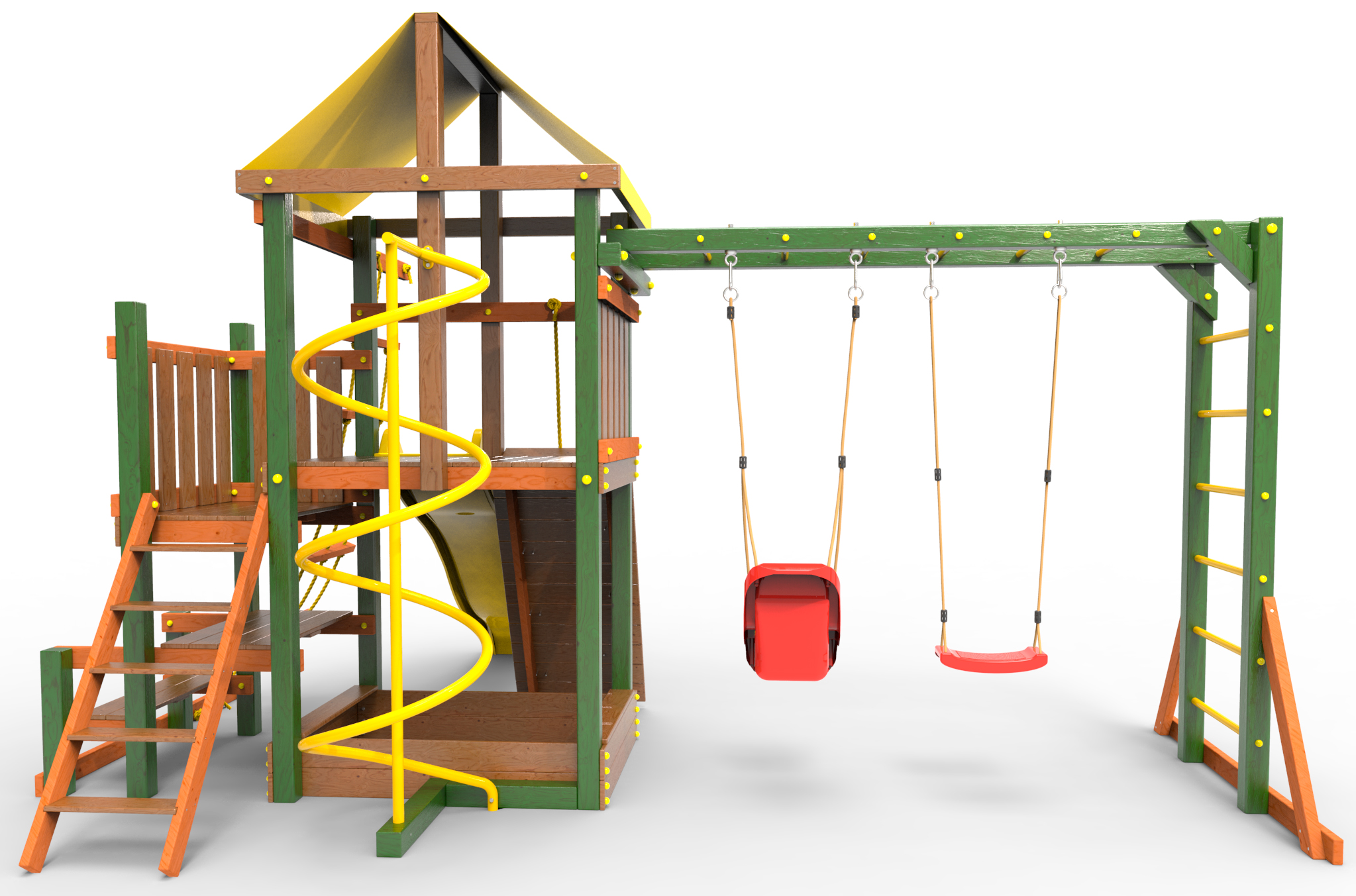 Обращаем Ваше внимание, что фактический цвет детской площадки может отличаться от представленных фото на сайте. Специфика окраски нетоксичными пропитками и красителями допускает отклонения в цветовой гамме отгружаемых изделий. Также обратите внимание, что фактический цвет может отличаться из-за цветопередачи устройства на котором Вы смотрите фото.