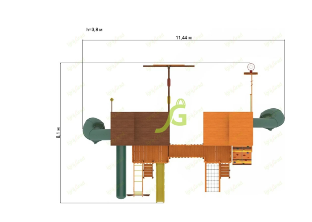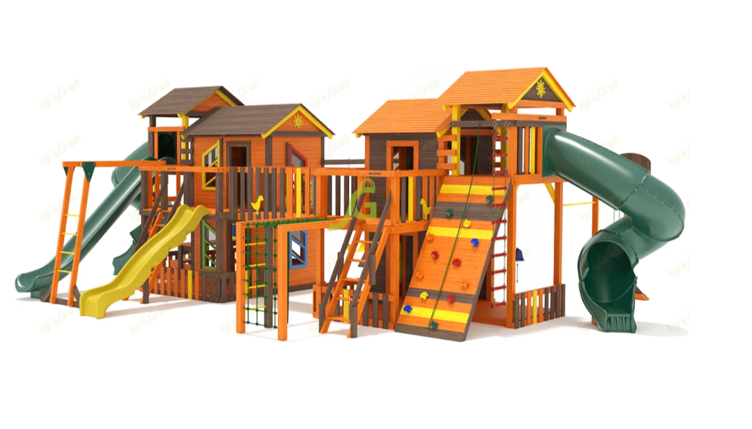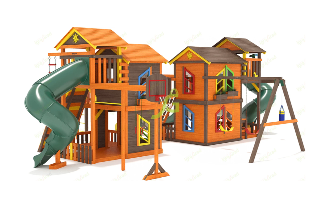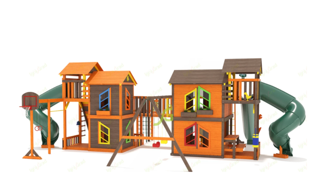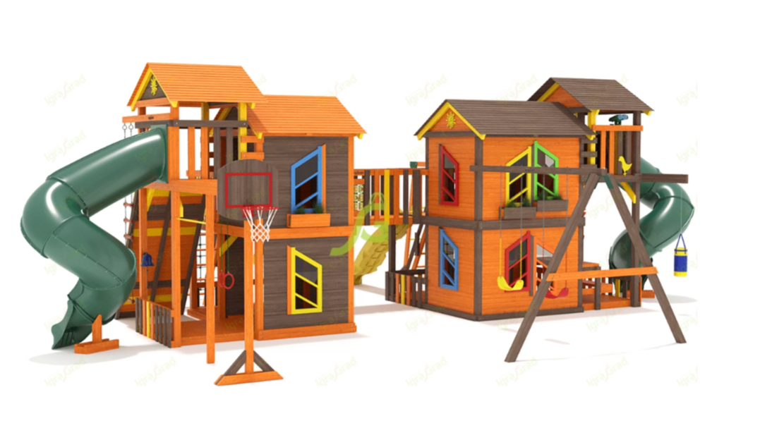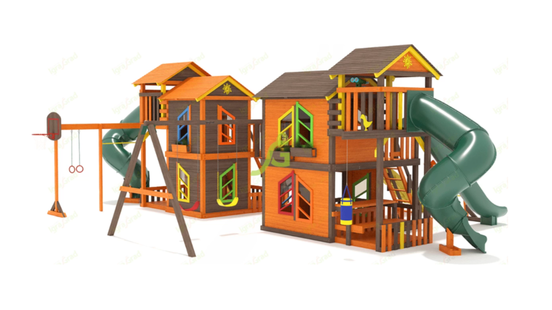Грандиозный деревянный комплекс укомплектован сразу несколькими игровыми домиками, соединенными между собой переходами-мостиками. Это двухуровневые башни с домиками и верандами, с дизайнерскими окошками и четырьмя горками – волновыми разной длины и горками в виде труб.