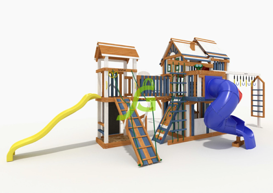 Можно кататься с горки, при этом дети не будут спорить, чья очередь скатываться. Ведь здесь присутствует сразу 4 разных горки: 2 волнообразные, 2 в виде трубы. Но возникает вопрос, как взобраться на желаемую горку? А вот это, самое интересное! Чтобы прокатиться с горки нужно сначала преодолевать путь препятствий. Но, всё зависит от предпочтений ребёнка, он может выбрать сложный или лёгкий путь, взбираясь только по деревянной лестнице или взбираясь по скалодрому, верёвочной лестнице.