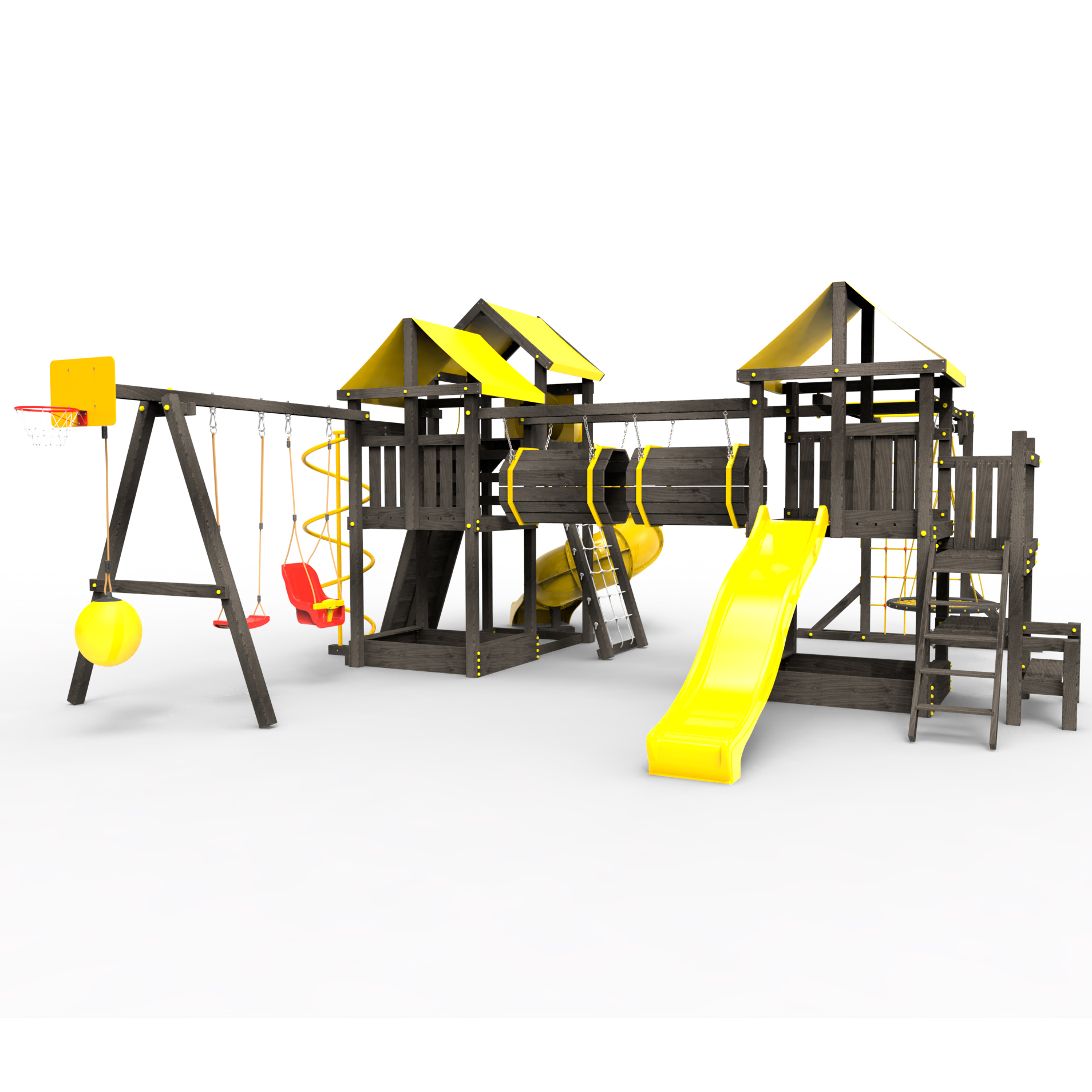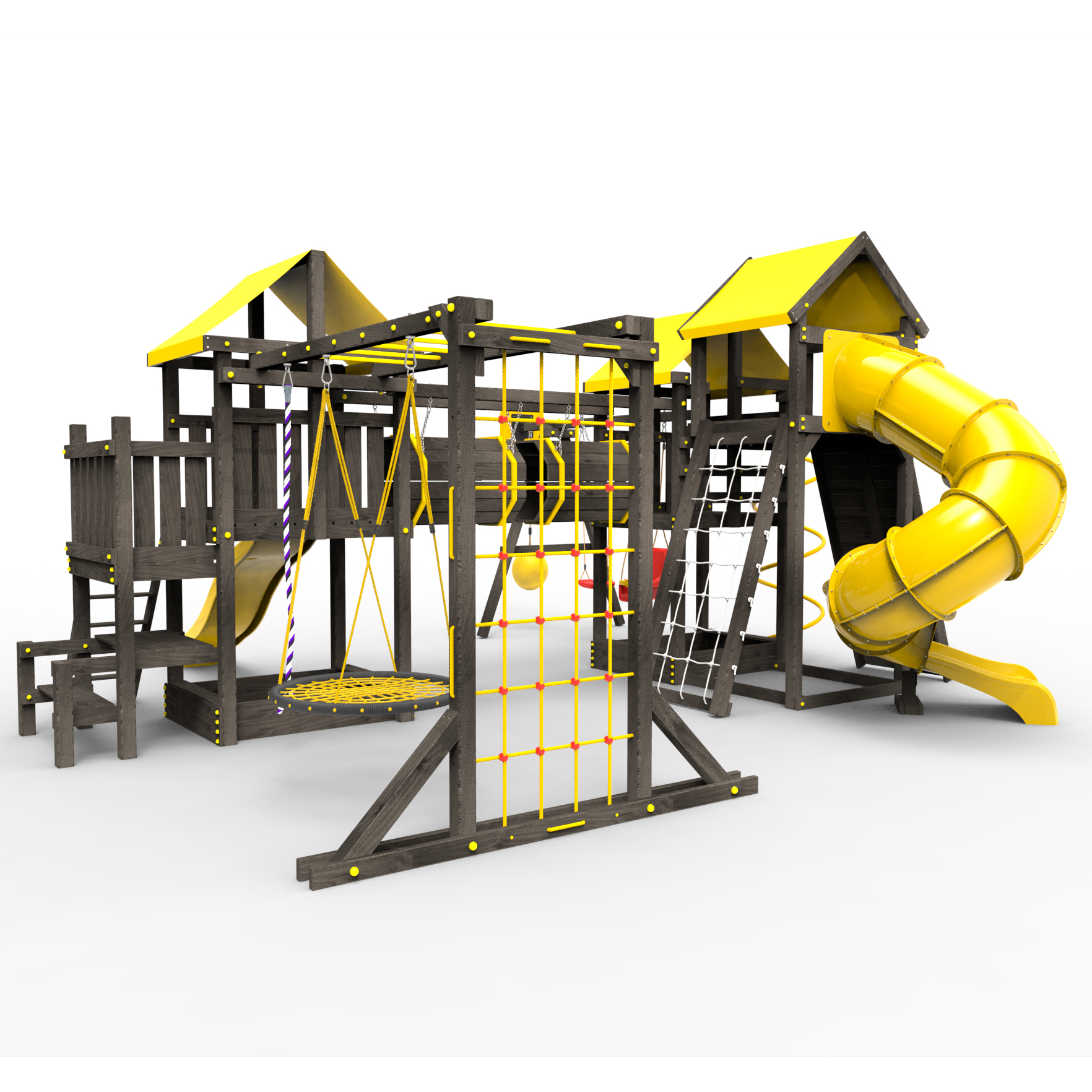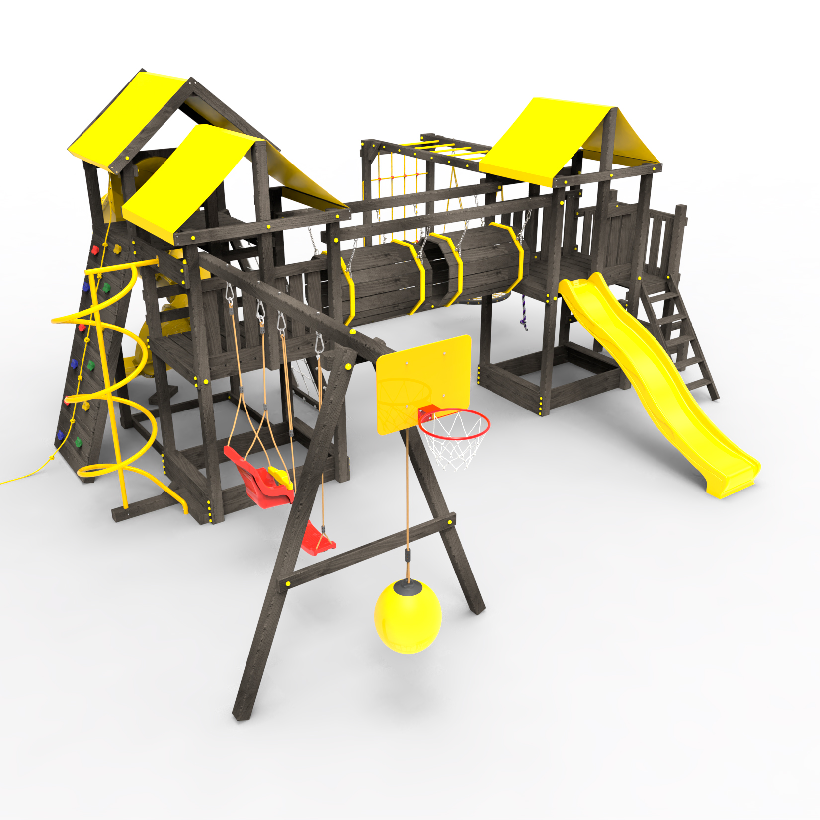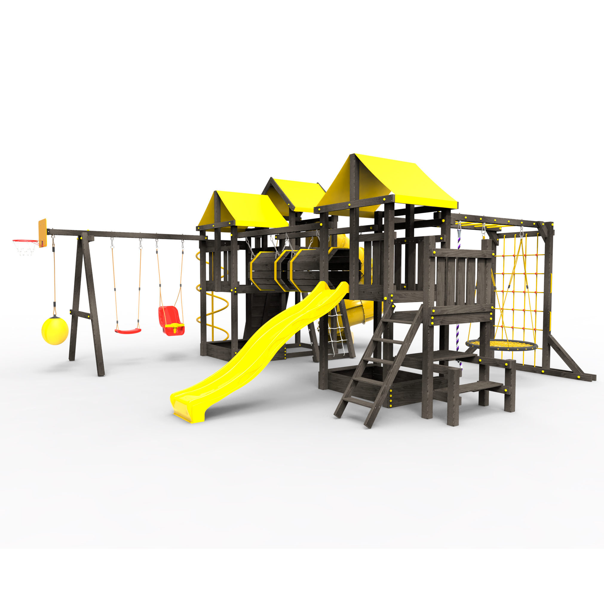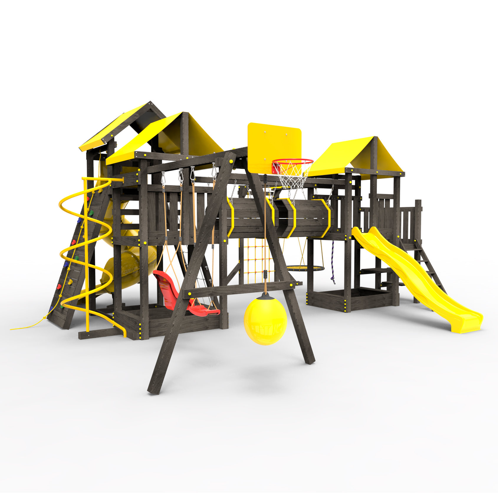 Два домика|Песочница|Лестница|Шторм-трап|Скалодром|Рукоход|Шведская стенка|Турник|Руфер|Баскетбольная корзина|Мостик|Горка|Спираль|Волна|Сеть для лазания|Качели |