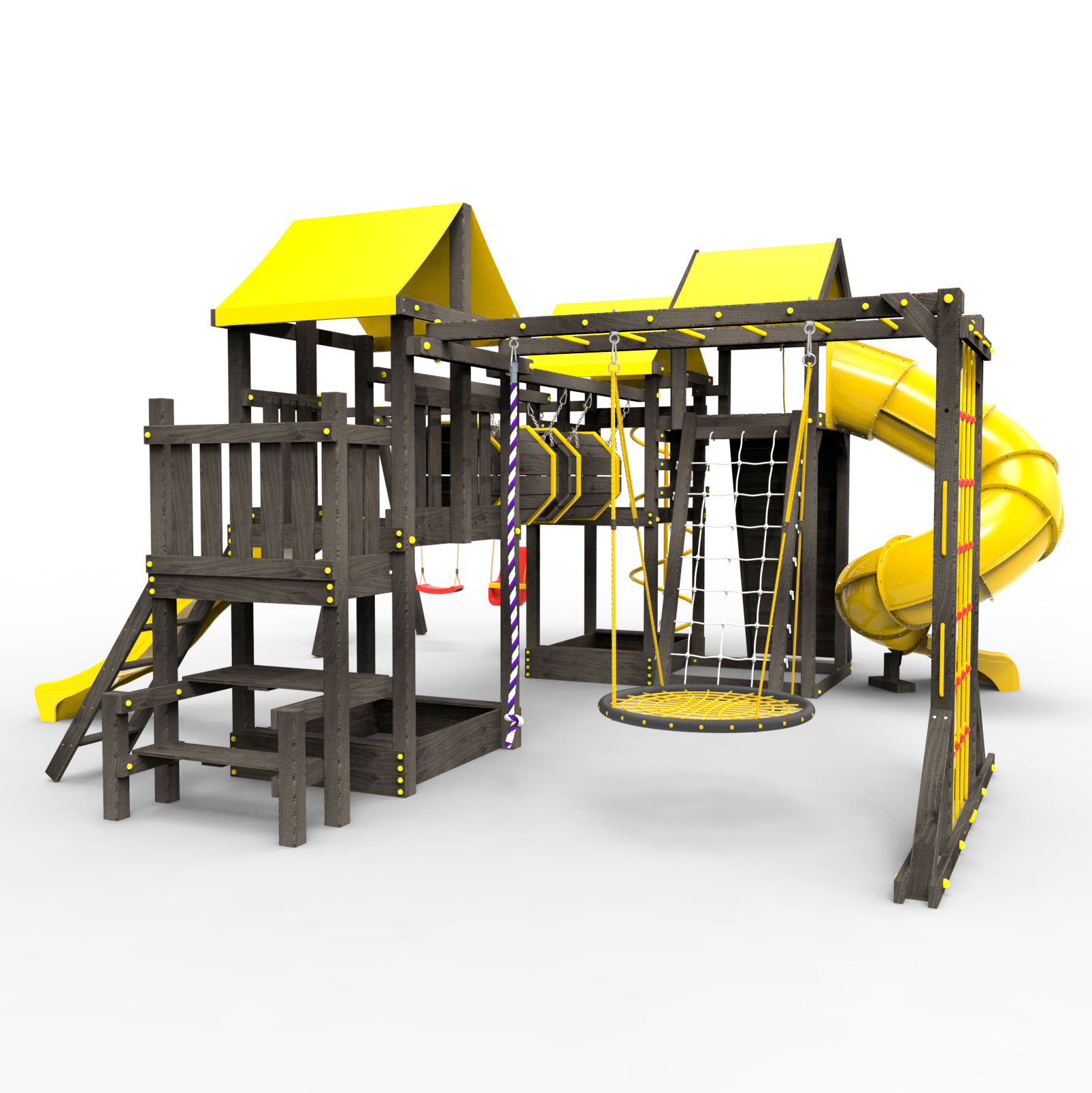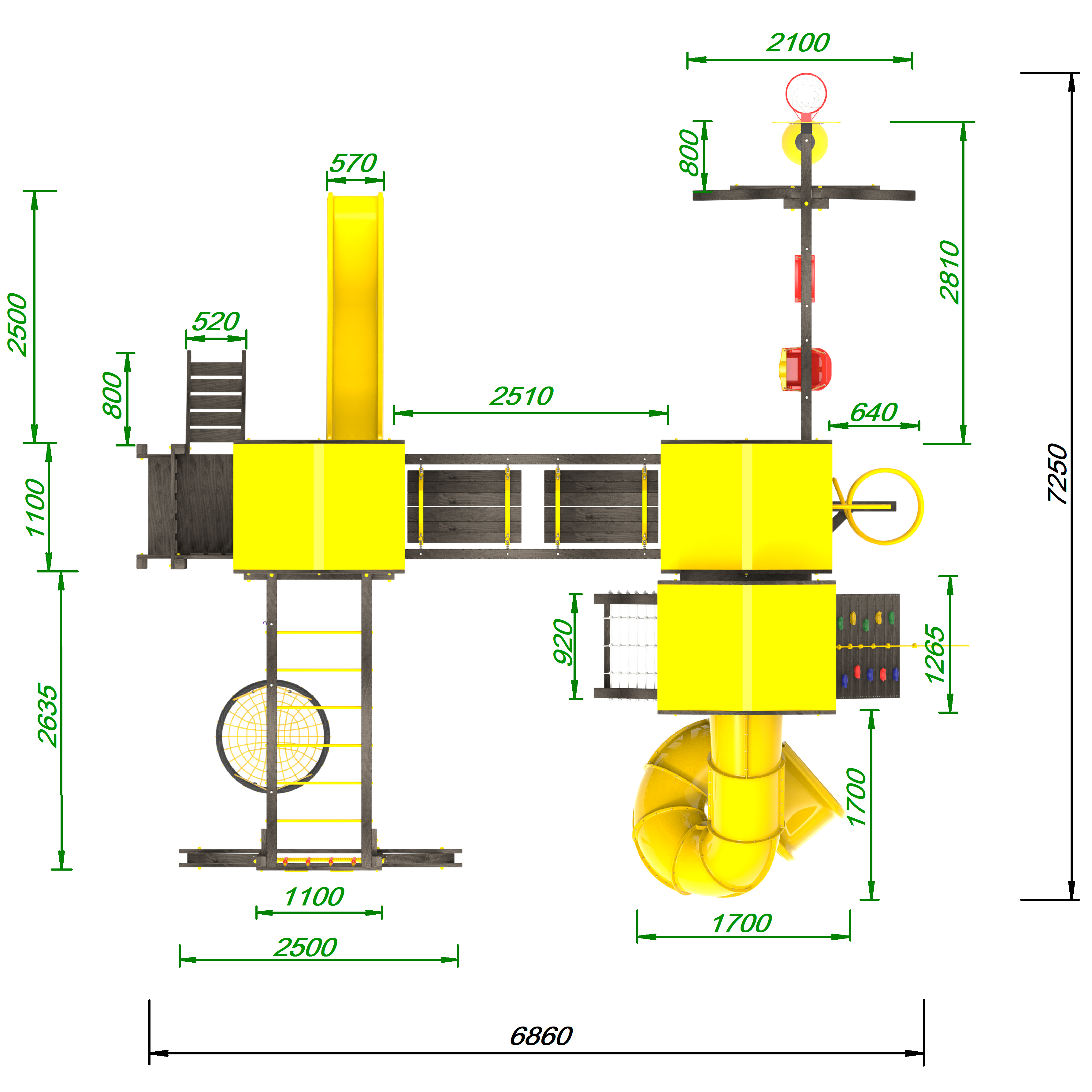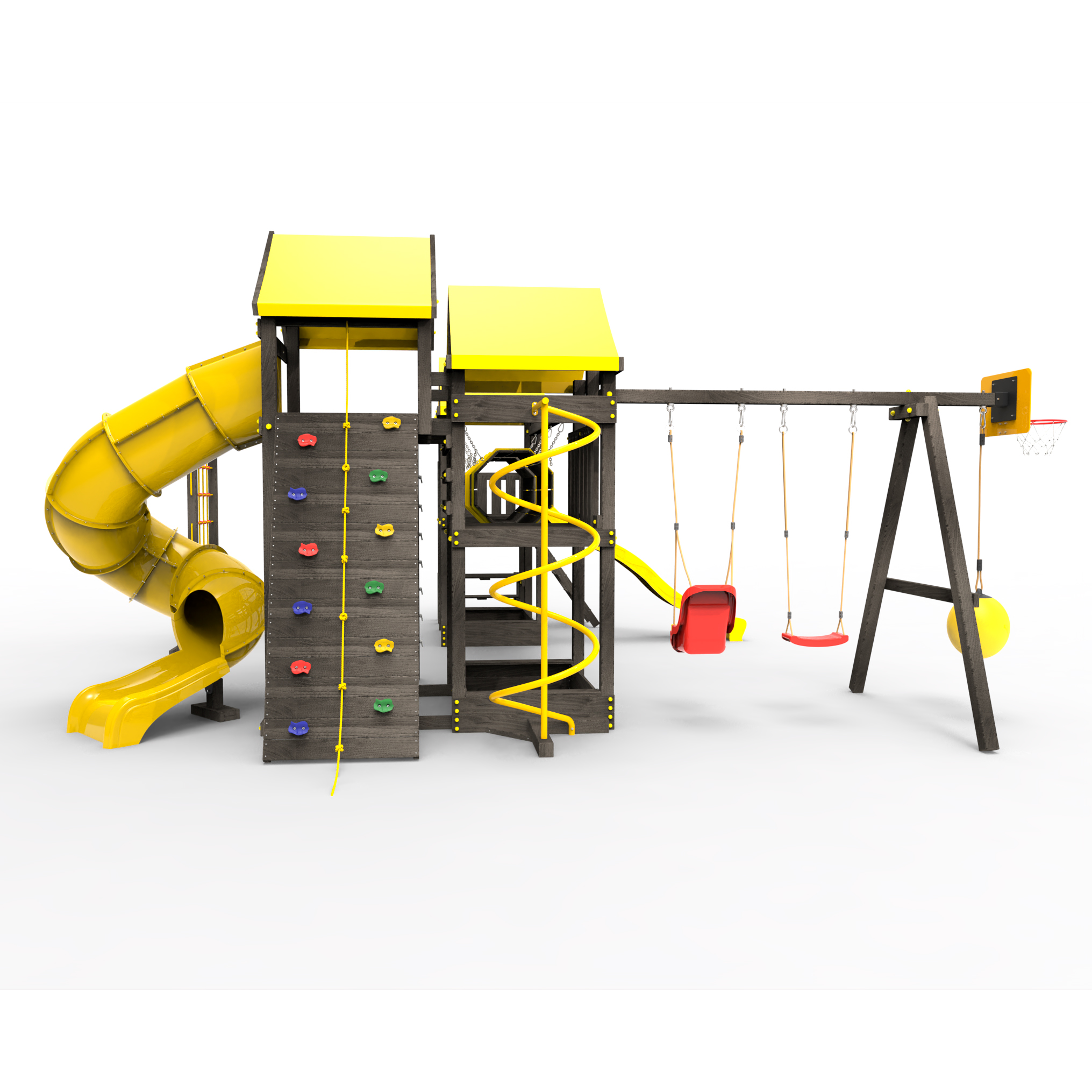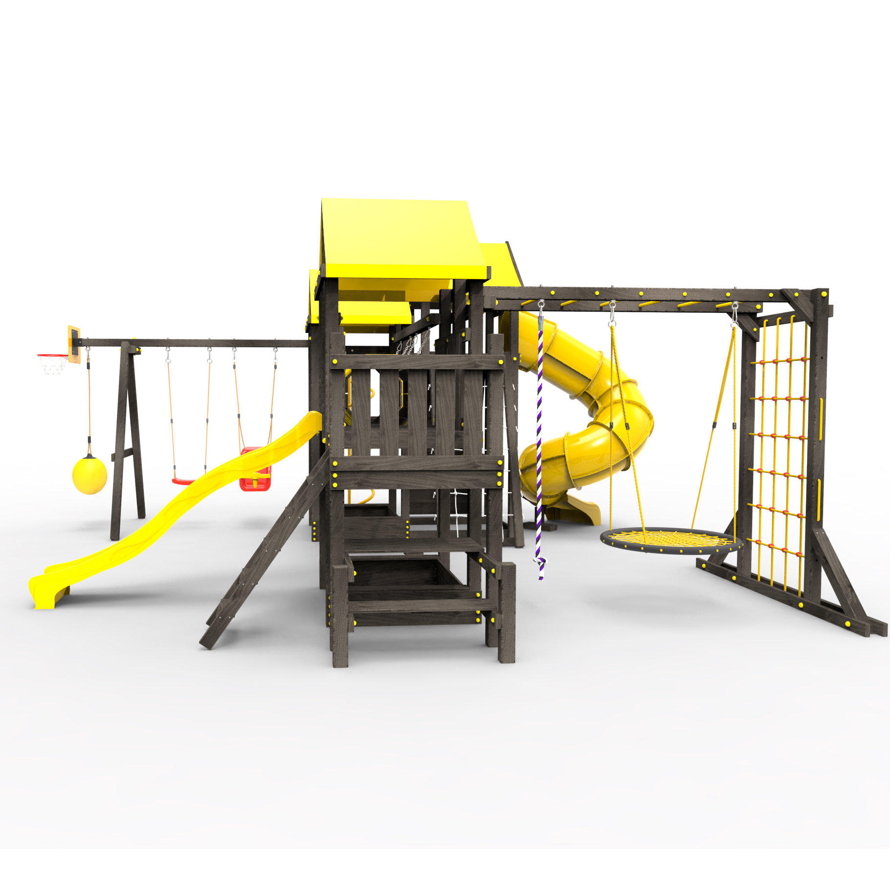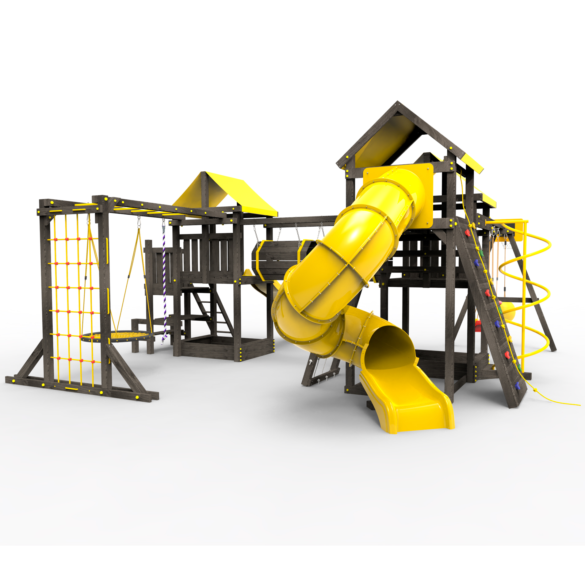 Два домика|Песочница|Лестница|Шторм-трап|Скалодром|Рукоход|Шведская стенка|Турник|Руфер|Баскетбольная корзина|Мостик|Горка|Спираль|Волна|Сеть для лазания|Качели |