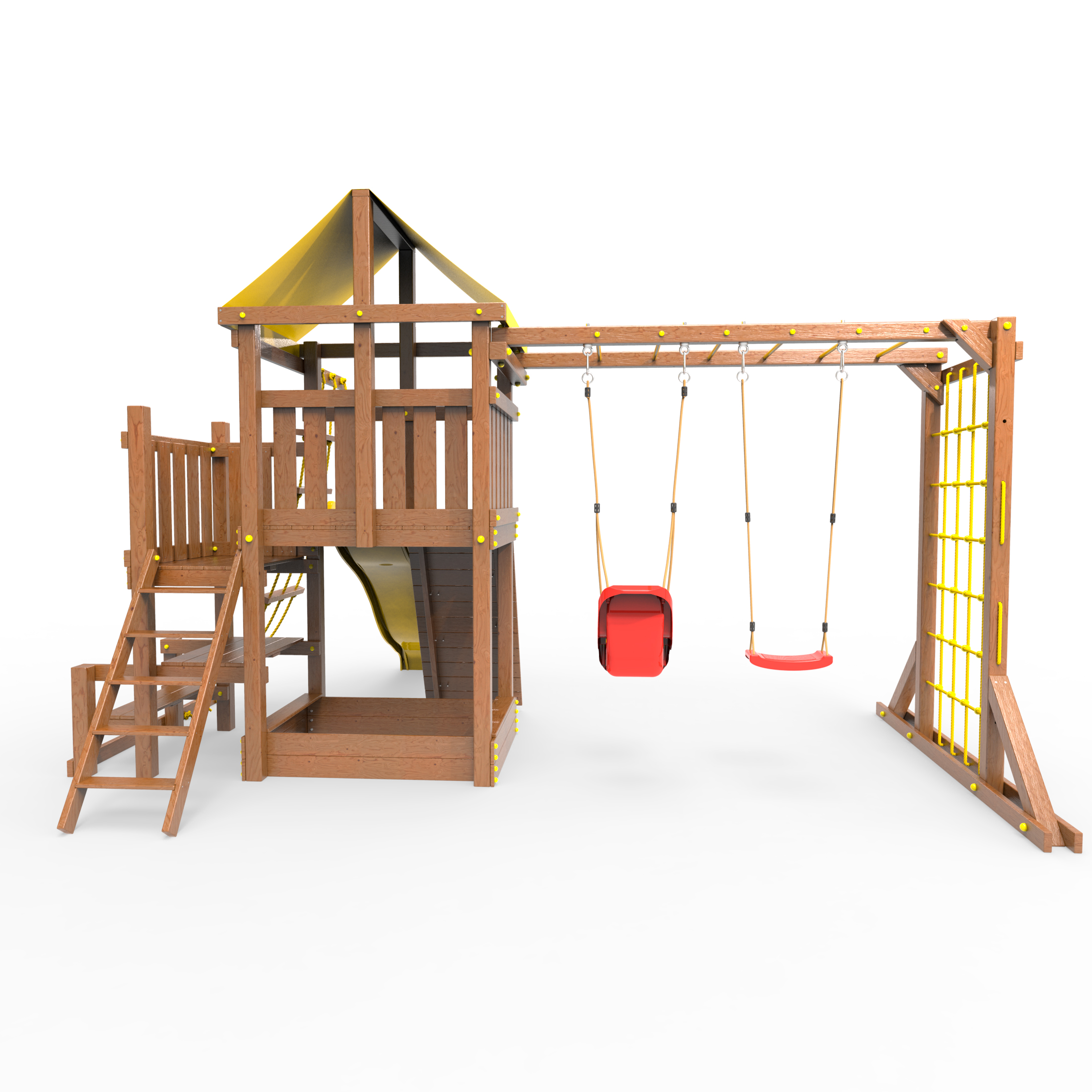 | Комплектация | Домик|Песочница|Лестница|Шторм-трап|Скалодром|Балкон|Столик с лавочками|Горка|Качели|Рукоход|Руфер|Сеть для лазания |