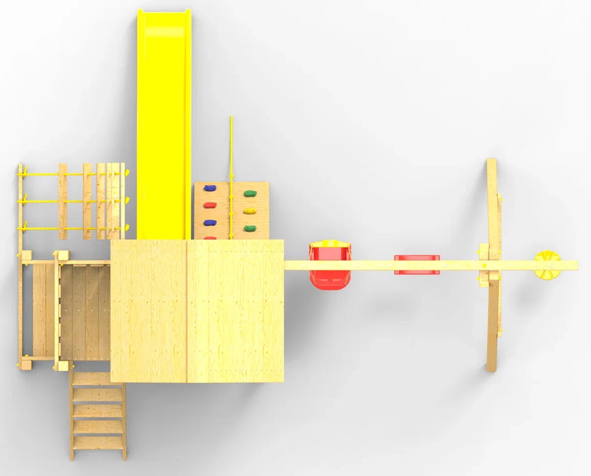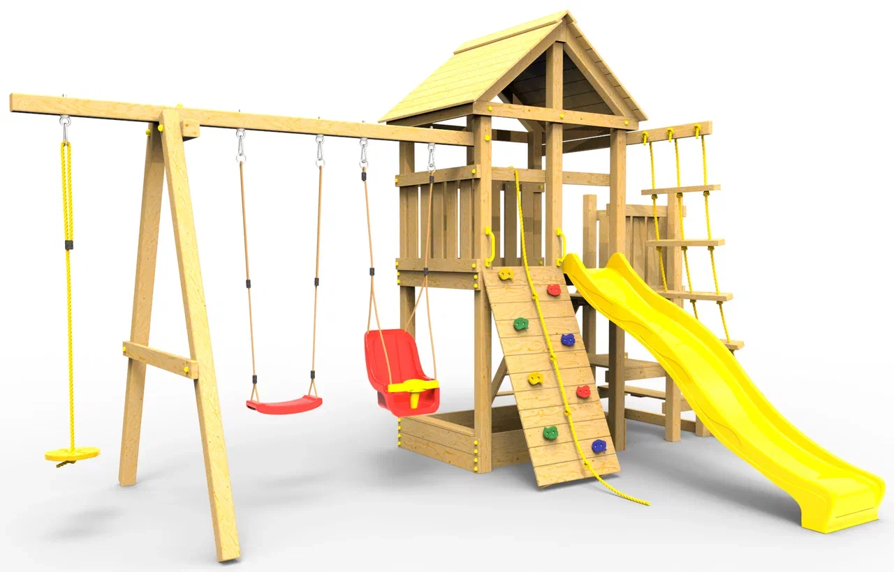 ● деревянная крыша ● трап 2м с канатом ● поручни для лестницы ● диван на цепях двухместный ● столик в песочницу