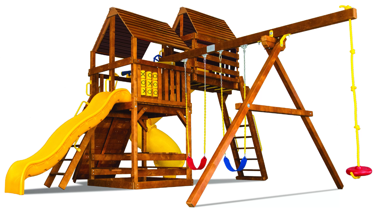 Площадка Циркус Фанхаус V ДК имеет максимальную комплектацию из возможных в серии Циркус. Здесь есть все о чем только могут мечтать дети. Спиральная горка с поворотом 270 градусов, горка двойная волна, 2 домика, скалодром, качели, встроенный столик со скамейками или песочница. Данный комплекс станет украшением любого загородного участка и отлично впишется даже в самый изысканный ландшафтный дизайн. При это он не занимает много места и может быть установлен на любую ровную поверхность.