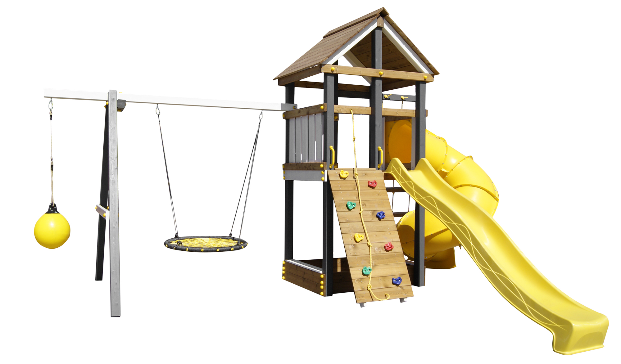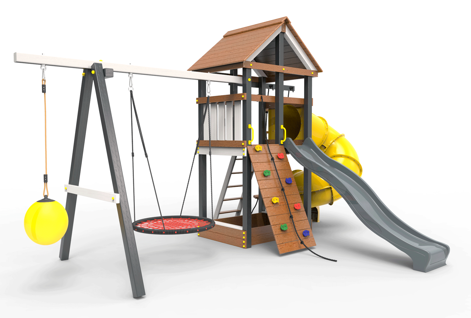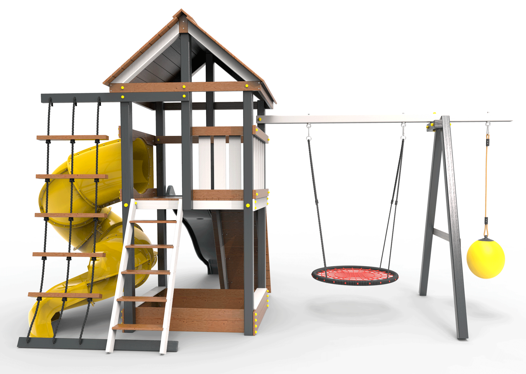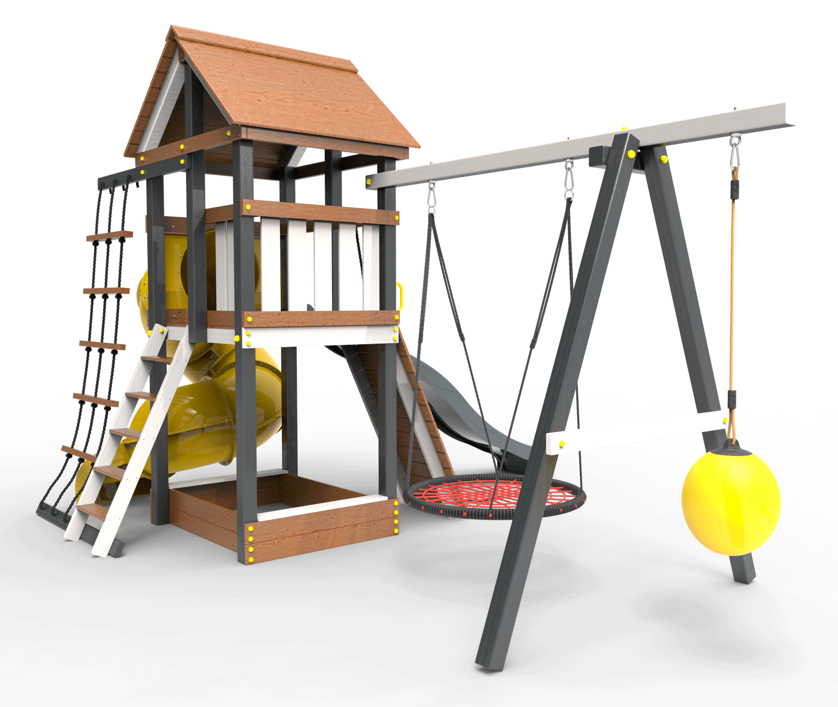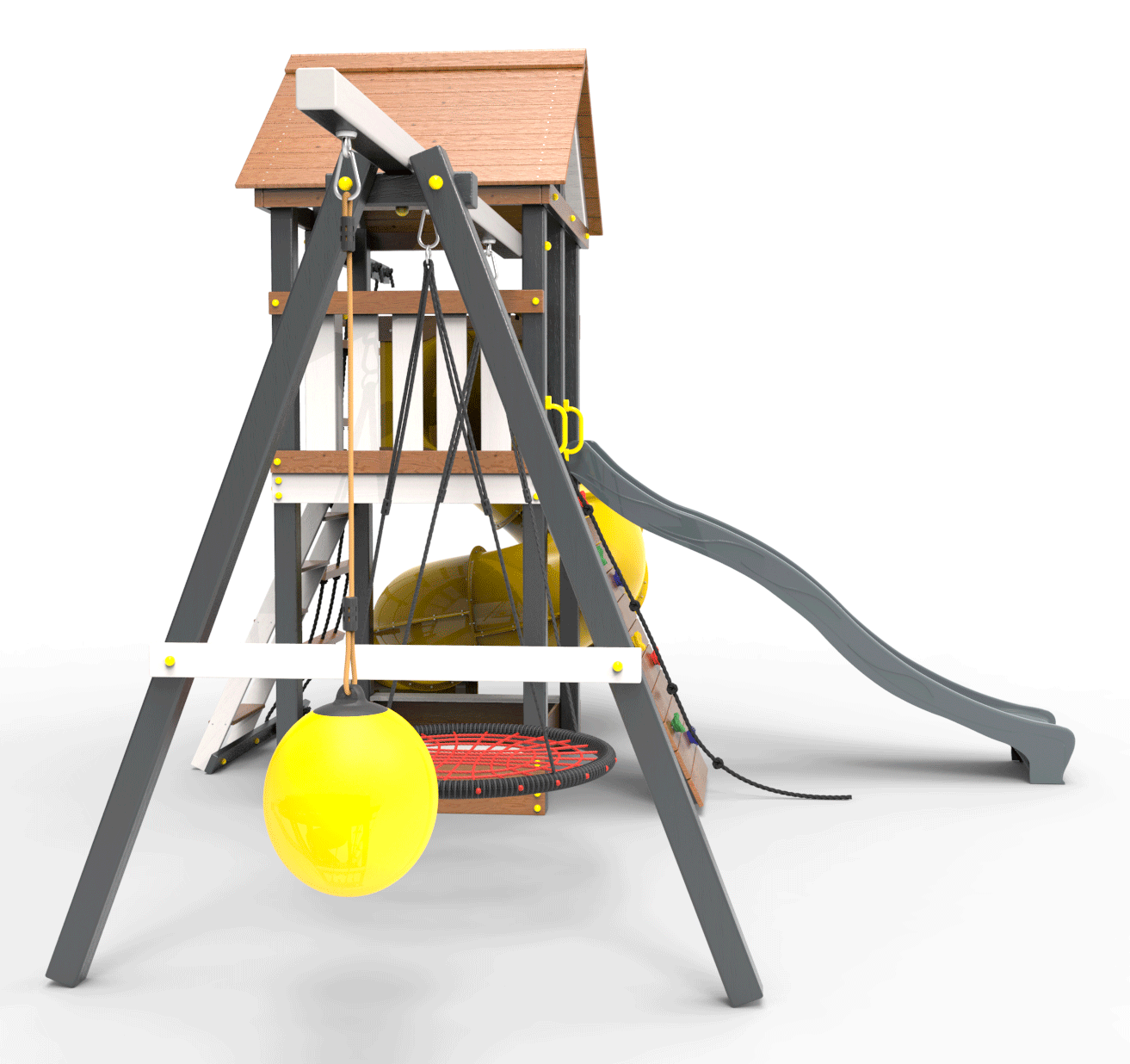 Детская площадка «Пикник Ультра 1 » представляет собой двухуровневую конструкцию, на первом уровне которой расположена песочница, а второй этаж представляет собой игровое пространство под деревянной крышей. Конструкция оснащена качельной балкой, повышенной прочности, которая имеет 5 креплений для качелей или любого другого навесного оборудования, шторм-трапом , двумя горками и скалодромом! .