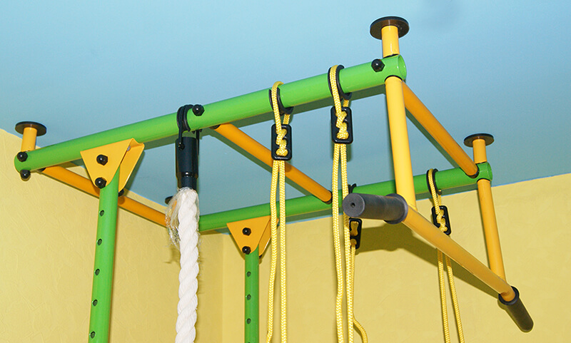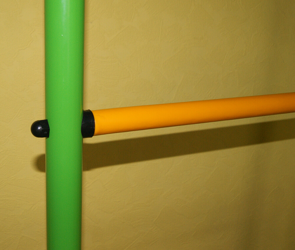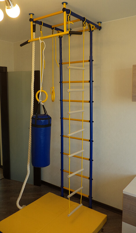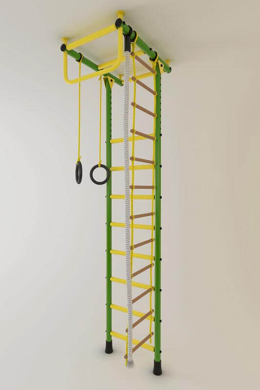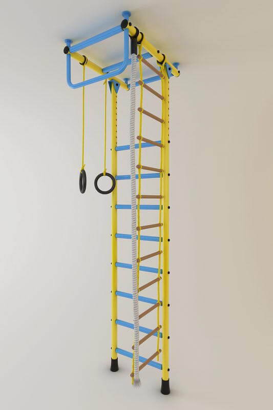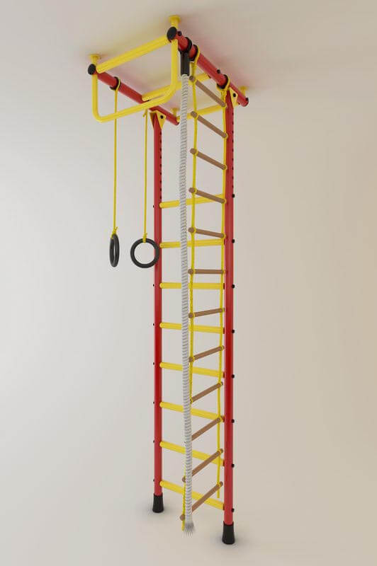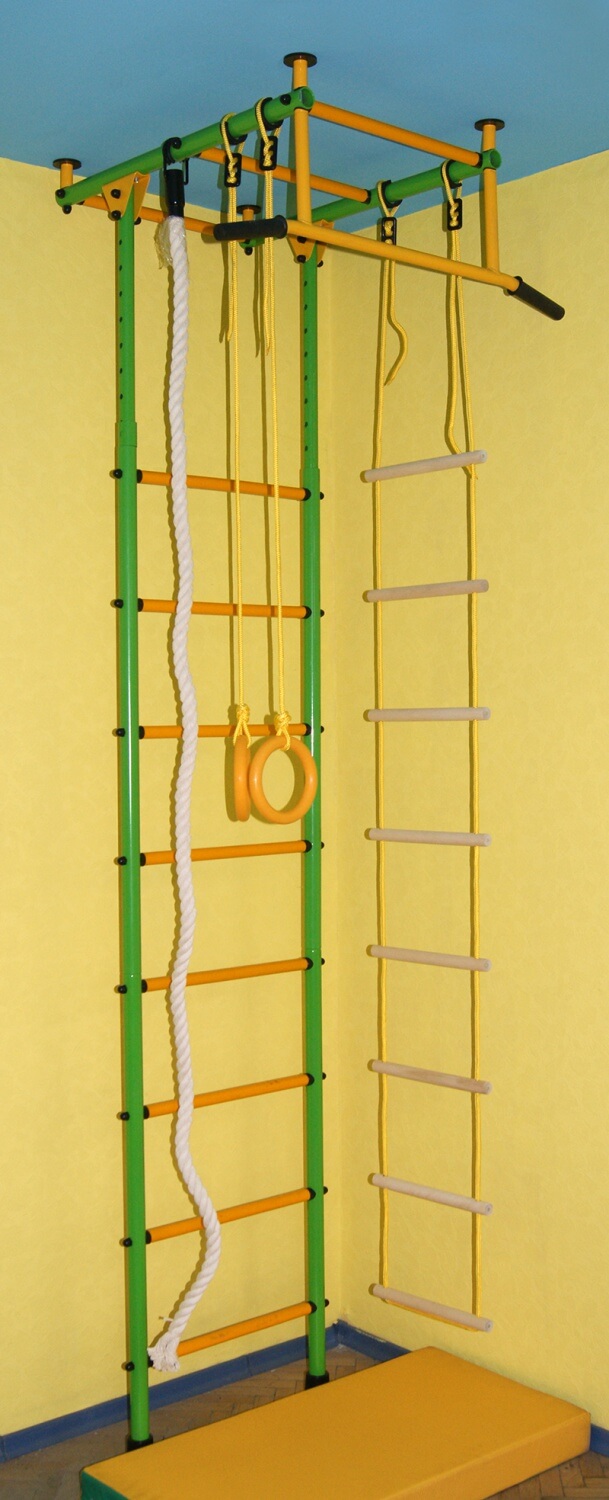 Данная шведская стенка имеет несколько вариантов величин: стандартная 2450-2800, средняя 2850-3200, высокая 2850-3500, ступени с покрытием ПВХ будут хорошим дополнением, можно включить в комплект дополнительное оборудование чтобы разнообразить занятия ребенка. Стойки - синие, зеленые или красные(яркие), ступени и турник – желтые, турник имеет 2 варианта.