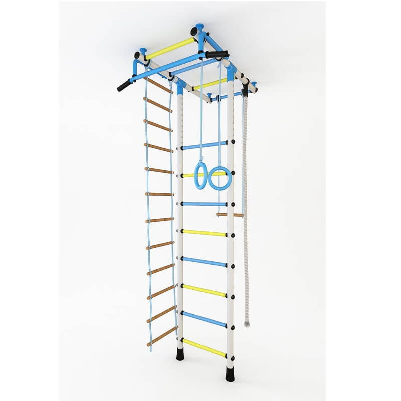 Комплектация: шведская стенка, рама, турник, канат, веревочная лестница, трапеция, кольца
