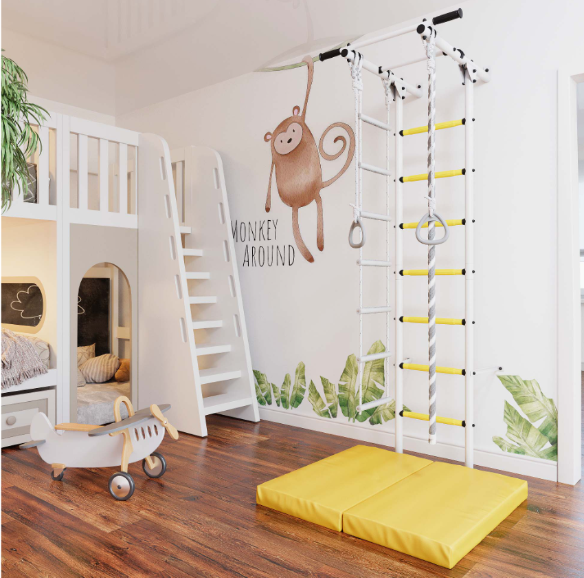 Желтый цвет ступеней гармонично сочетается с белым корпусом, спортивный уголок стильно выглядит в любом интерьере.
