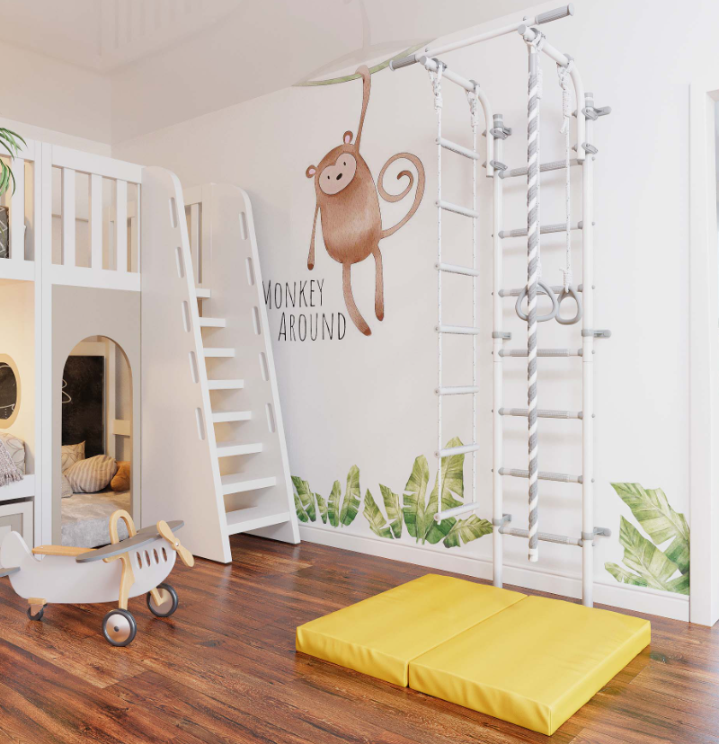 Пастельный цвет ступеней гармонично сочетается с серым корпусом, спортивный уголок стильно выглядит в любом интерьере.