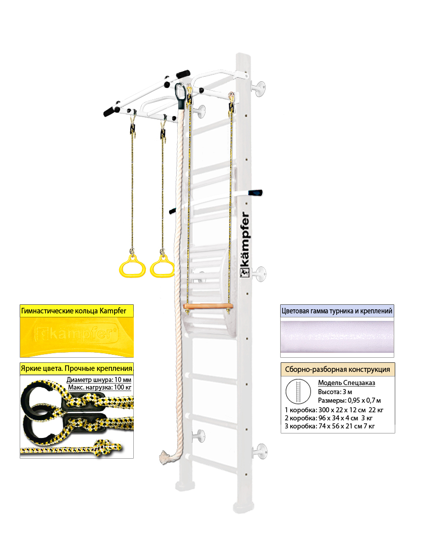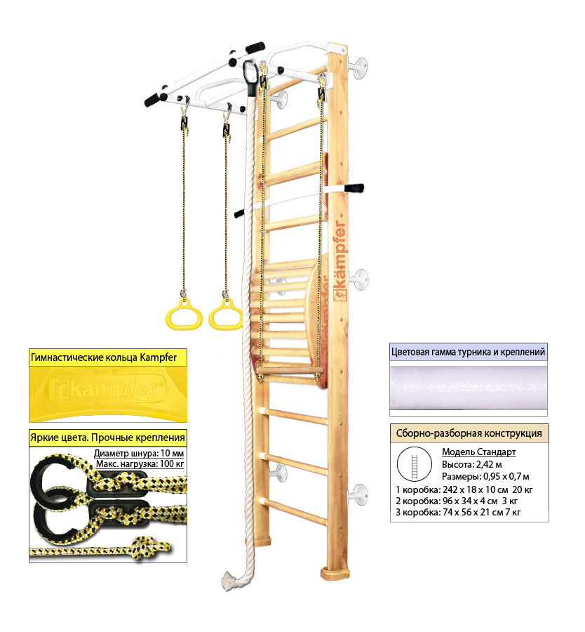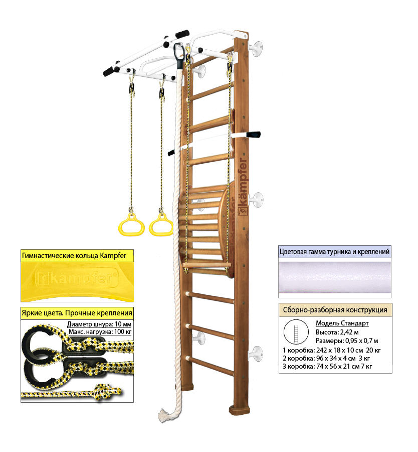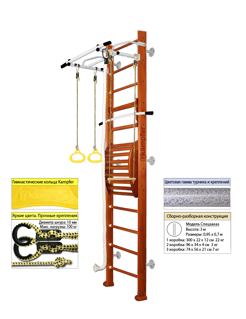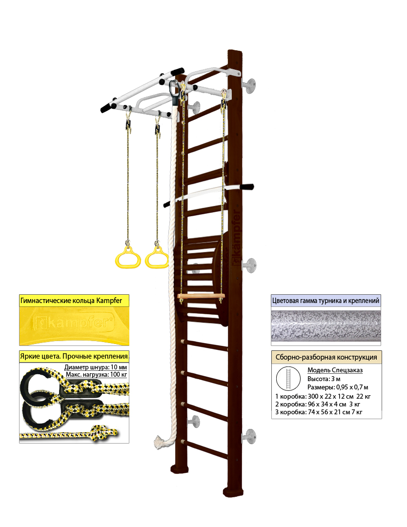 Крепкий металлический турник выдерживает нагрузку до 120 кг, подходит как детям так и взрослым. Навесное оборудование Kampfer на прочных тросах выдерживает нагрузку до 100кг. Особенностью пристенной шведской стенки Kampfer Helena Maxi является шесть креплений к стене, в отличие от обычных пристенных моделей, у которых только четыре крепления.Увеличение количества креплений до шести обеспечивает самые надежные и максимально безопасные занятия на ДСК Kampfer.