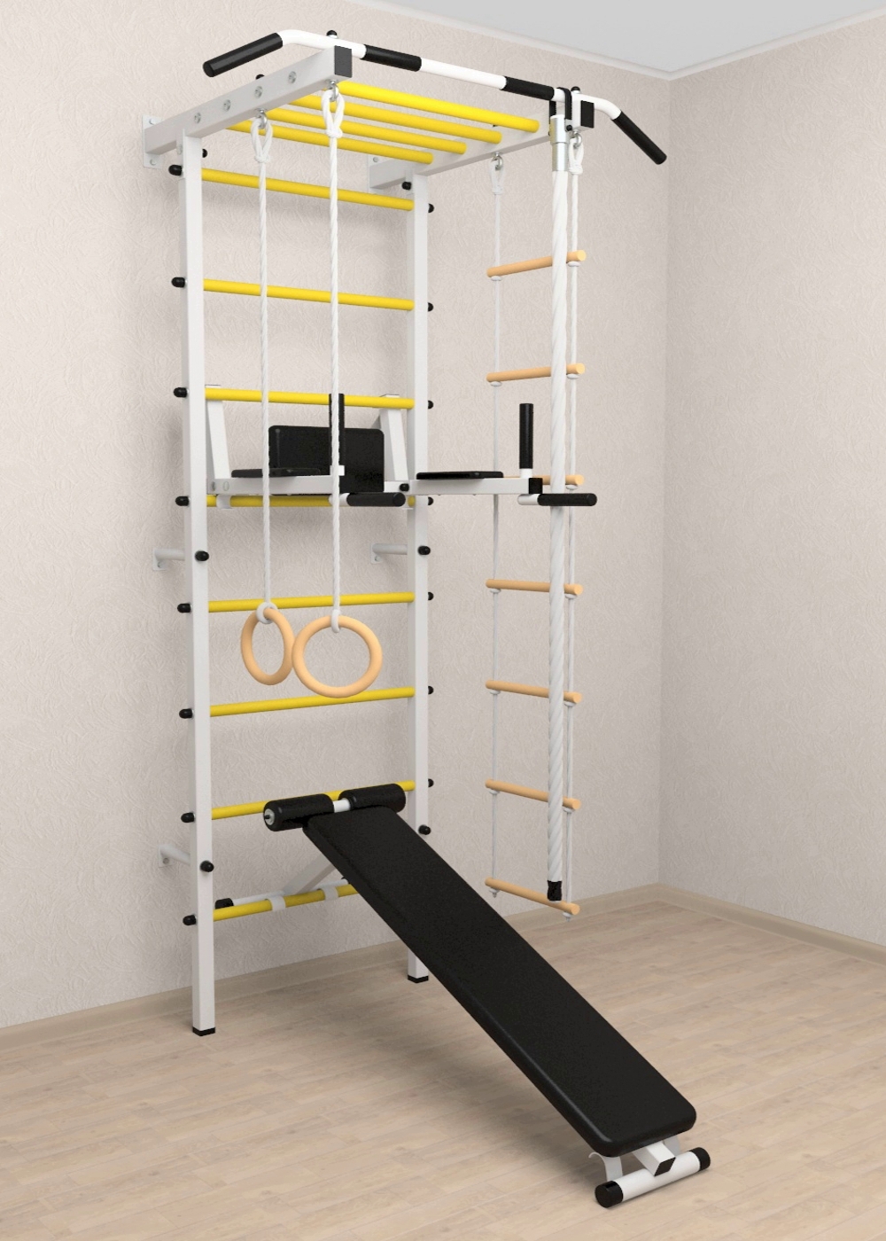 - комплект: канат с крепежом, кольца гимнастические деревянные, лестница веревочная
