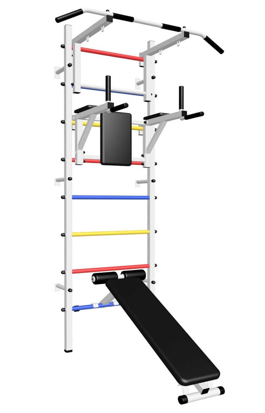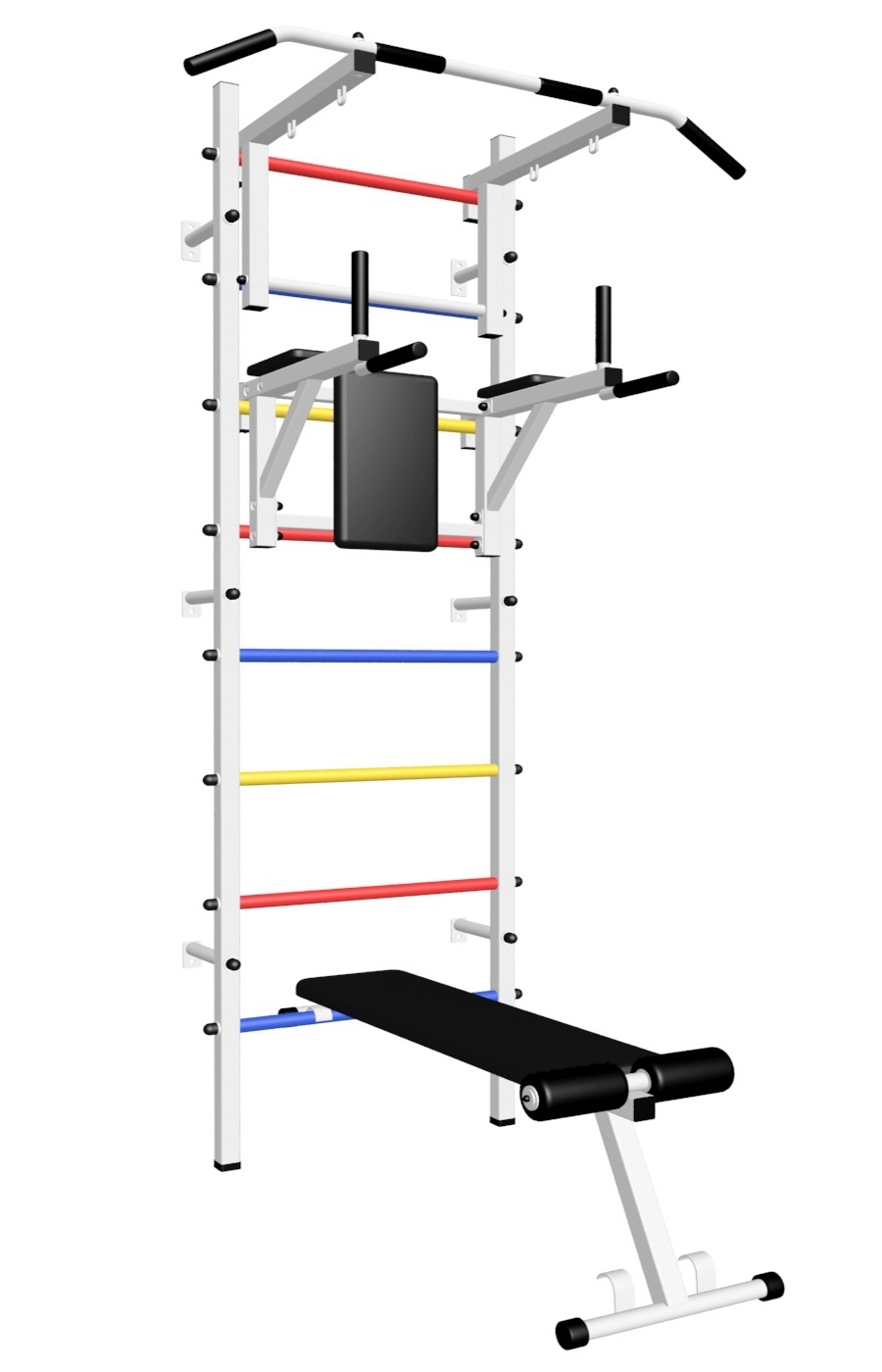 - Цвет покраски: белый; Цвет фурнитуры: черный; Цвет ступеней: черный, разноцветный, синий, желтый, красный.