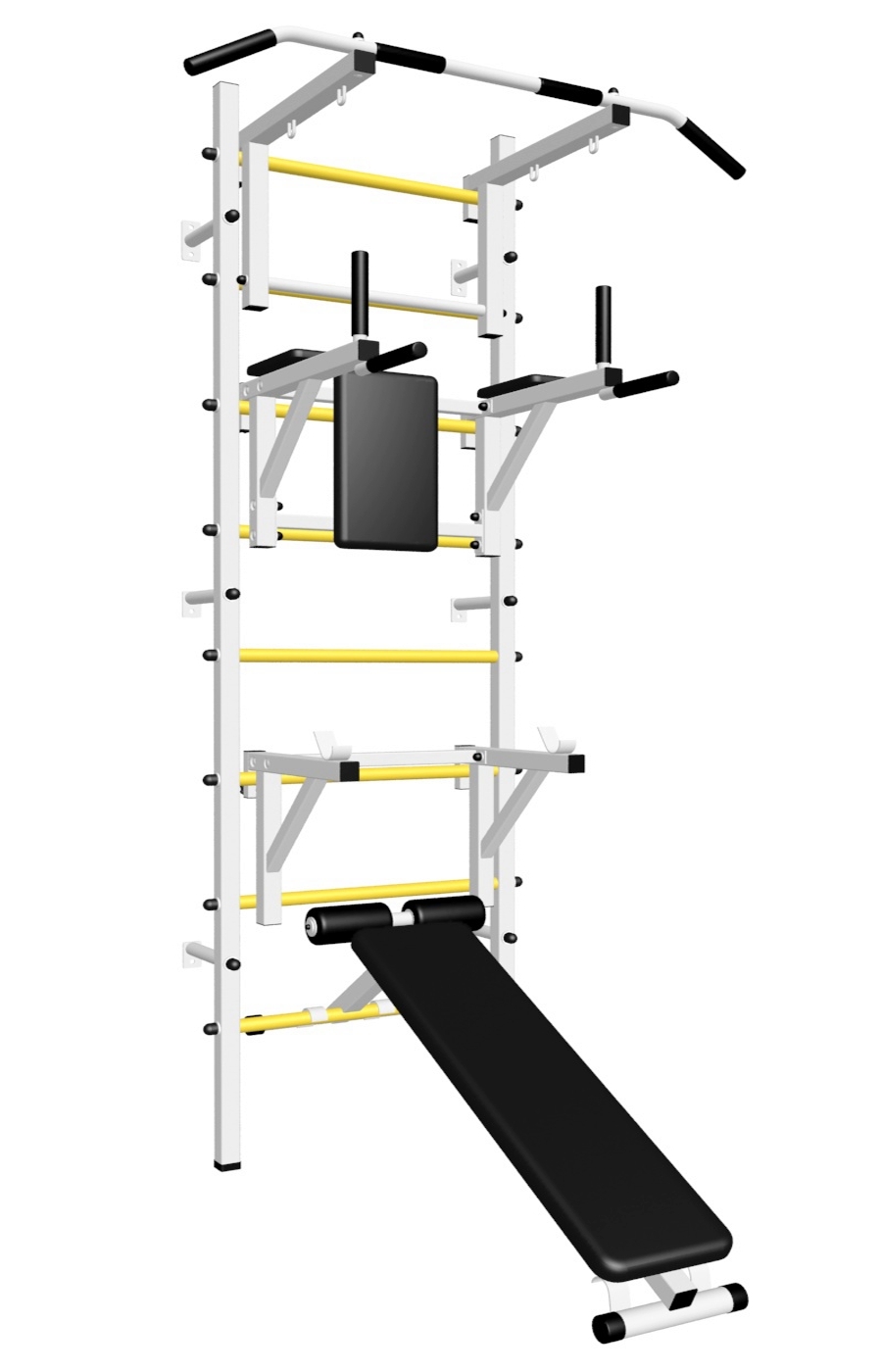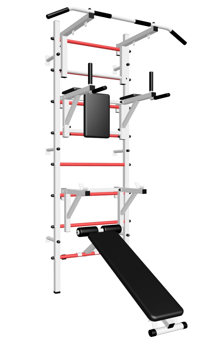 Стойки шведской стенки Sv Sport стандарт изготовлены из профильной трубы 40 х 40 х 2 мм. Ступени изготовлены из круглой, стальной трубы, покрытой резиной (не скользят, не натирают мозоли, не прокручиваются, не имеют запаха, приятны на ощупь). Устанавливается к стене при помощи 6 кронштейнов. На перекладину, в местах хватов, одеты резиновые ручки.