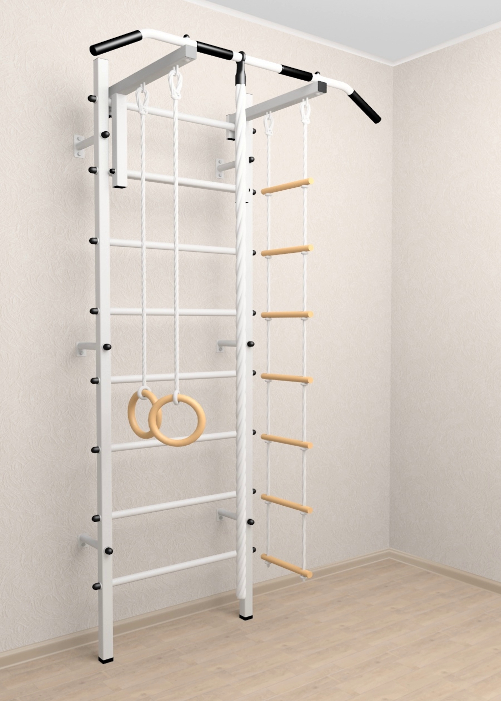 - Комплект: канат с крепежом, кольца гимнастические деревянные, лестница веревочная