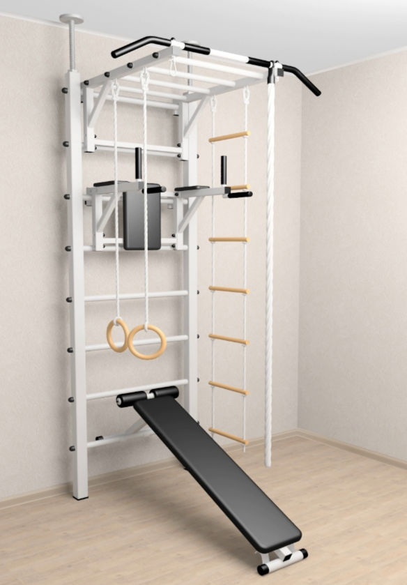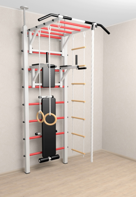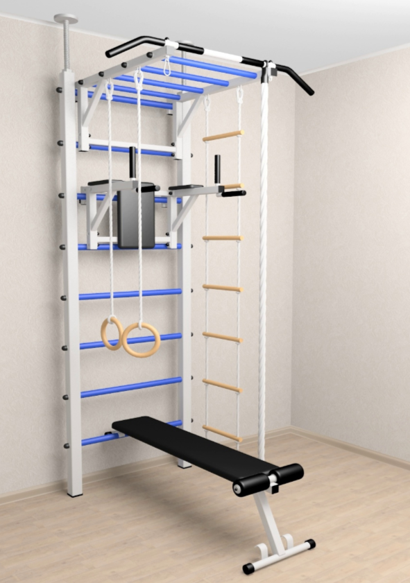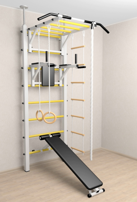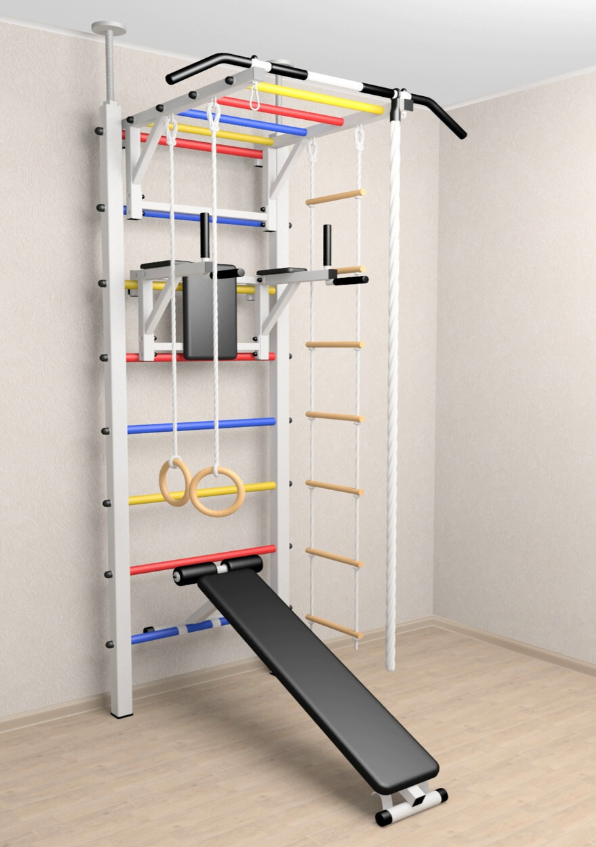 - Комплект: канат с крепежом, кольца гимнастические деревянные, лестница веревочная