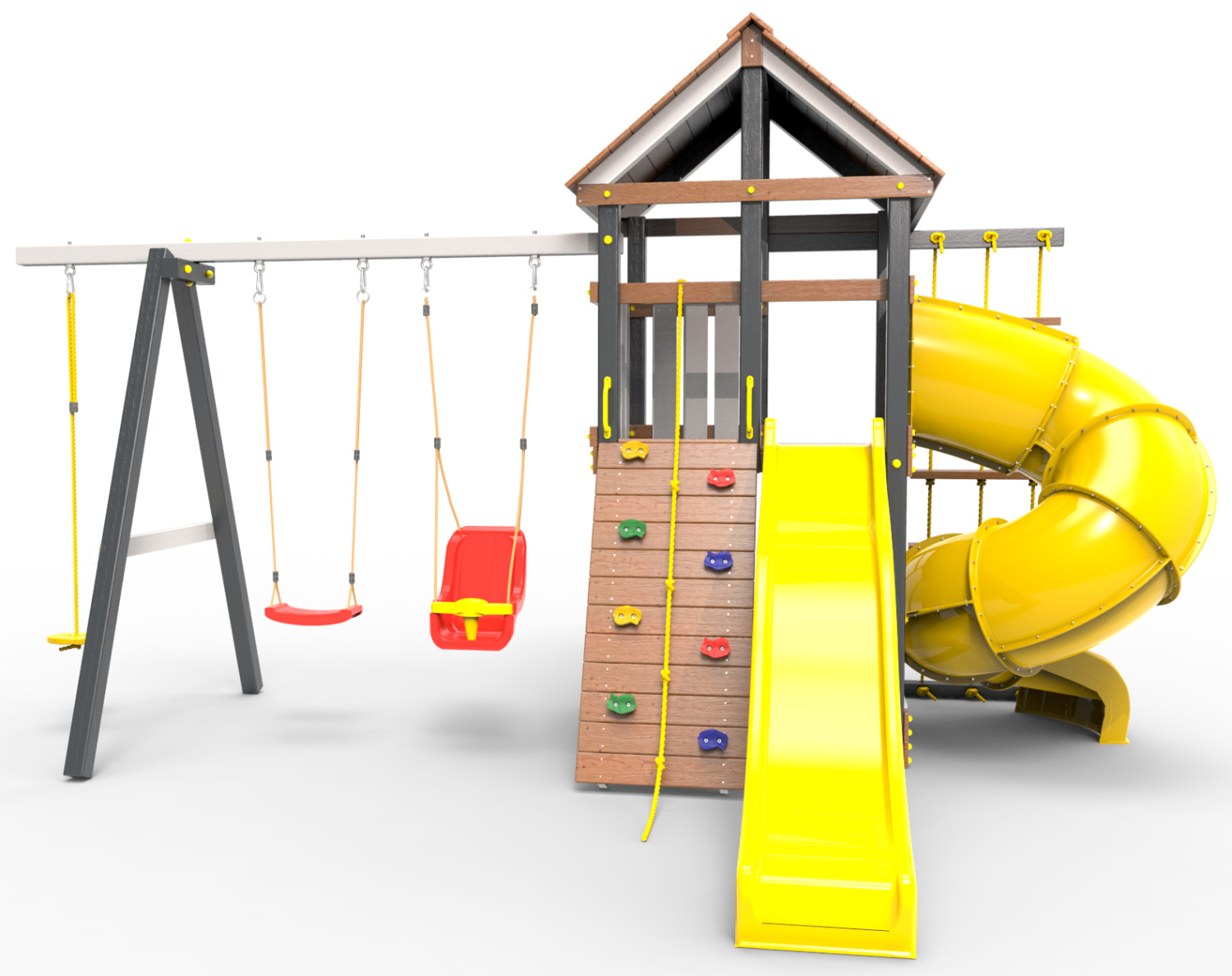 Детская площадка «Пикник Ультра 1 » представляет собой двухуровневую конструкцию, на первом уровне которой расположена песочница, а второй этаж представляет собой игровое пространство под деревянной крышей. Конструкция оснащена качельной балкой, повышенной прочности, которая имеет 5 креплений для качелей или любого другого навесного оборудования, шторм-трапом , двумя горками и скалодромом! .
