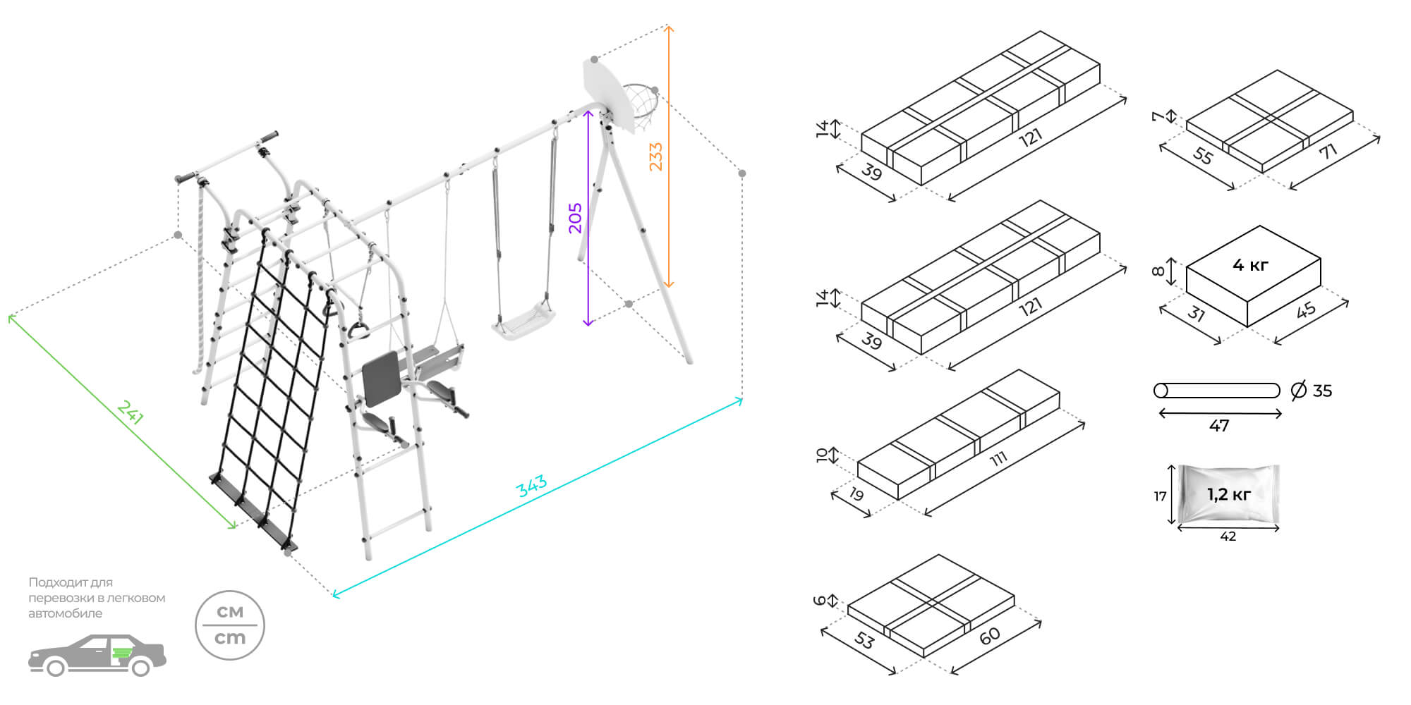 Преимуществом оборудования является то, что им могут пользоваться одновременно двое или даже трое малышей. В комплекте предлагаются цепные качели, качели пластиковые, удобная сетка лаза и брусья со спинкой и кольцами.