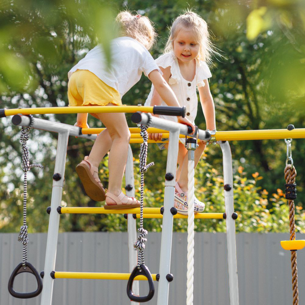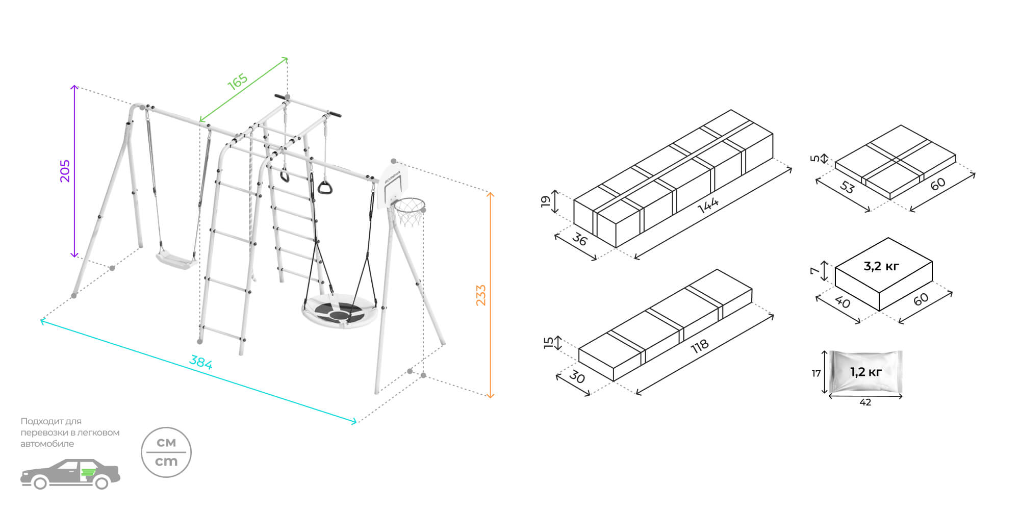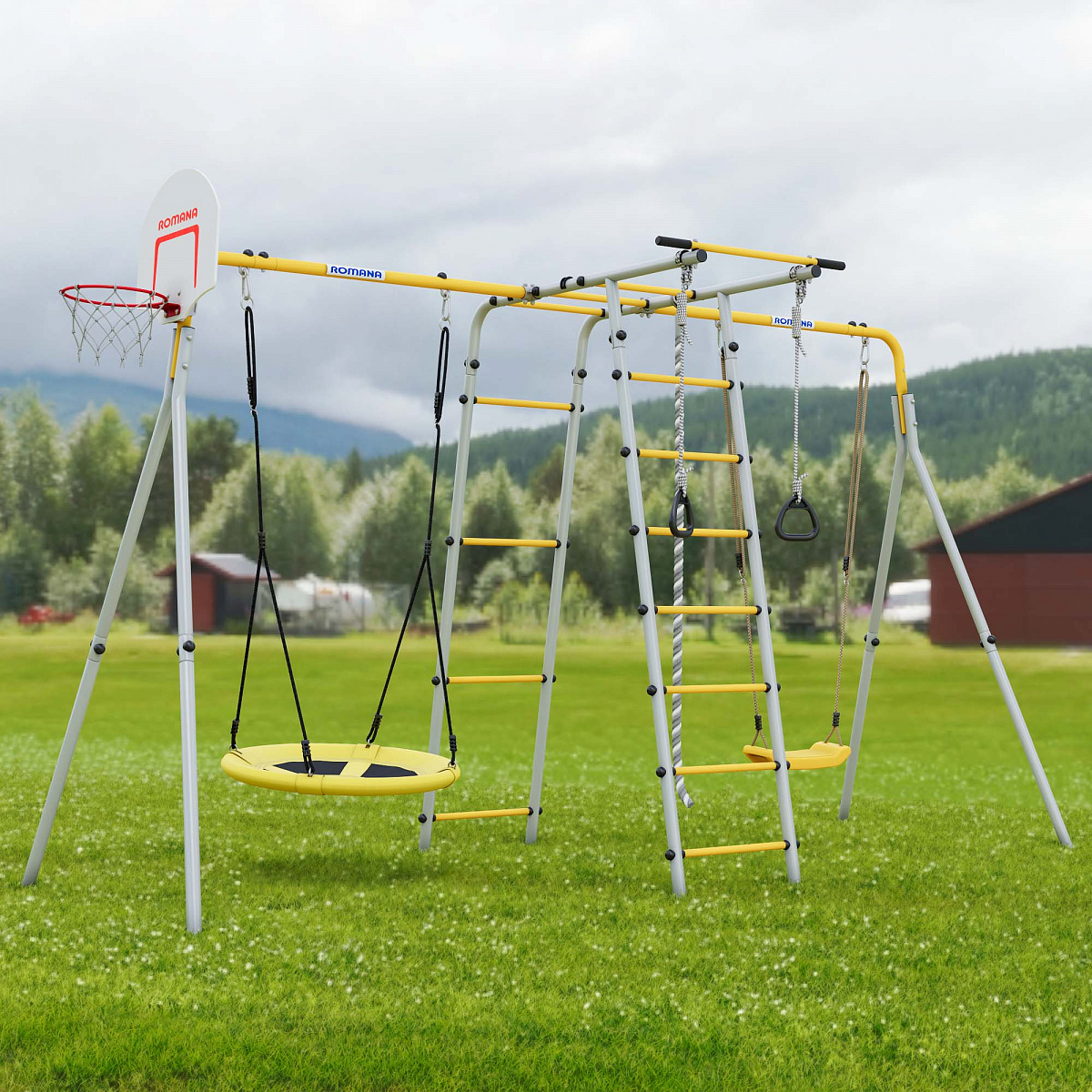 Любители качелей смогут покататься на аттракционе "гнездо". Также предусмотрены кольца, баскетбольный щит и всевозможные лестницы.