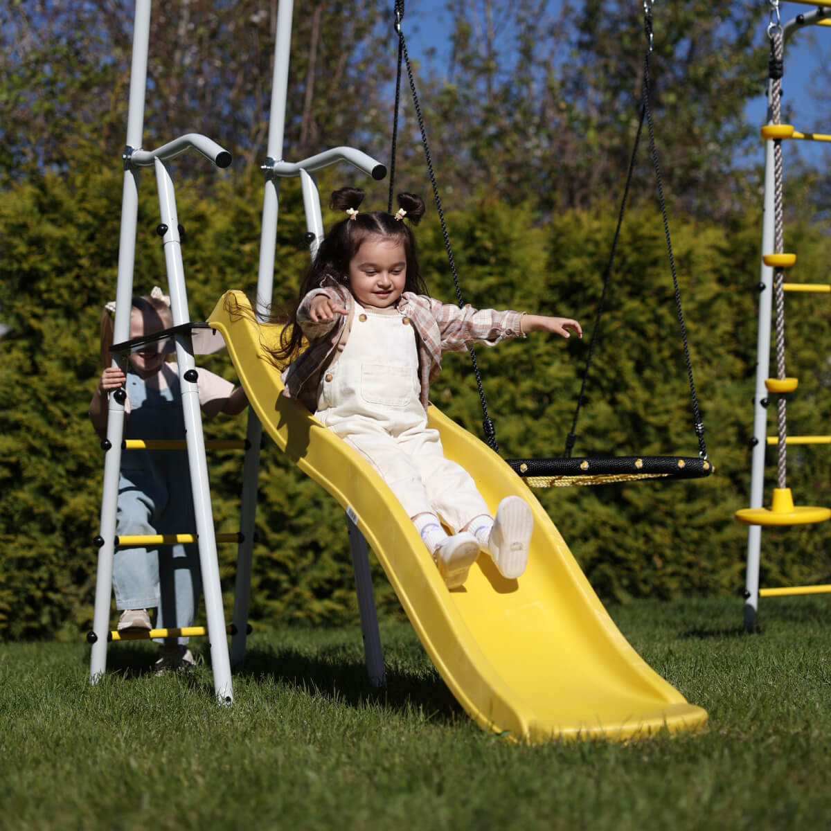 Игровой комплект прекрасно подойдет для расширения детского игрового пространства. Спортивные элементы не только обеспечивают ребенку веселый досуг и положительные эмоции, но и способствуют его физическому развитию с раннего возраста. Катание на качелях развивает ловкость, координацию, выносливость, а также укрепляет вестибулярный аппарат. Игры на горке развивают голеностопные суставы, преодолевается страх высоты и развивается решительность, а также укрепляют мышцы ног и рук. Конструкция горки обеспечивает безопасность ребенка: бортики защищают от падений, а обтекаемая форма предотвращает ушибы.