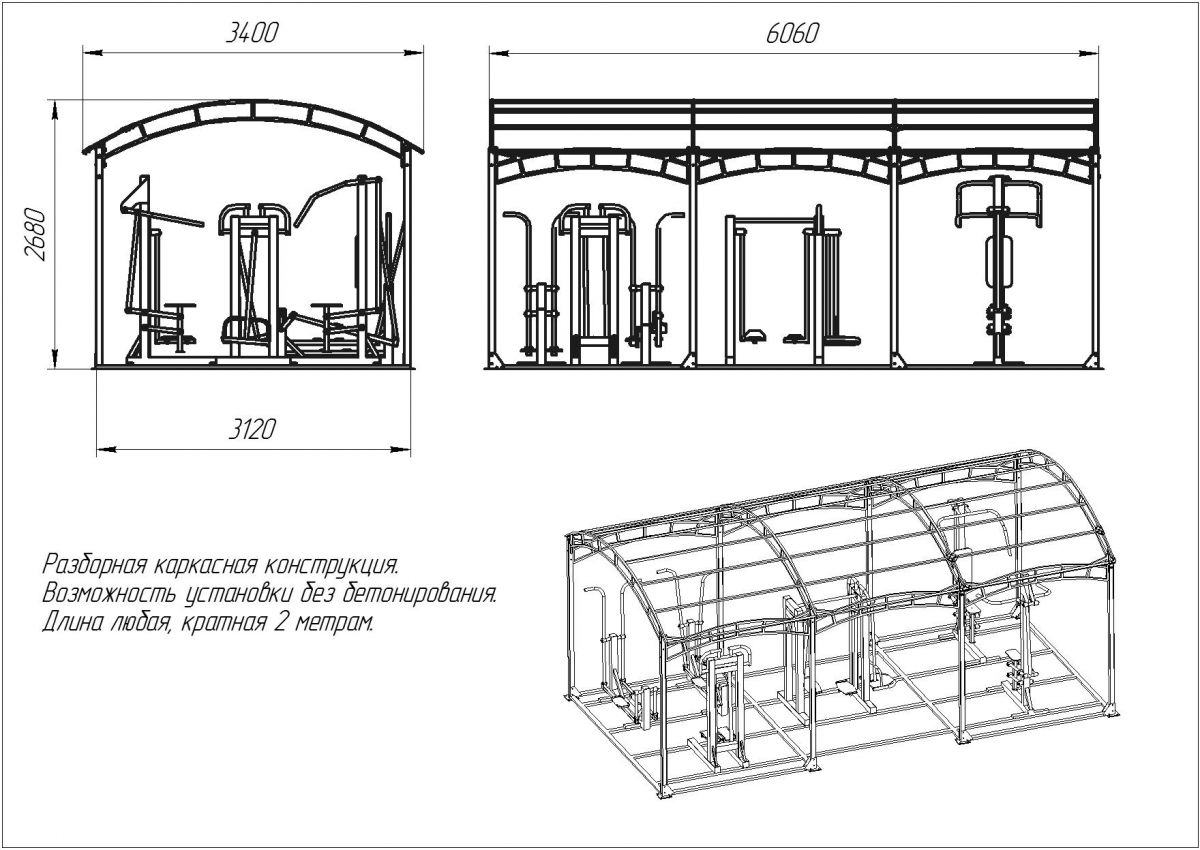 Возможно изготовление навеса как с бетонируемыми опорами и основаниями тренажеров, так и с креплением к металлической обрешетке.