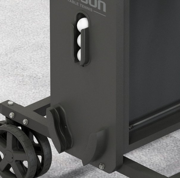 На боковых панелях, которые находятся сразу под сеткой, есть отделения для хранения ракеток и мячей. На каждой боковой панели можно разместить по 2 ракетки и 3 мяча.
